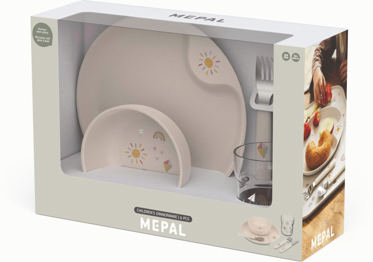 Mepal Mio Børnesæt kombinerer funktionalitet og sikkerhed i et komplet spisesæt designet specielt til små børns behov. Dette 6-deles sæt i de muntre farver Sunshine & Rainbow gør måltiderne til en fornøjelig oplevelse, mens det samtidig understøtter barnets udvikling af selvstændige spisefærdigheder.Sættet indeholder alt det nødvendige til et komplet måltid: en praktisk tallerken, en dyb skål, et ergonomisk glas samt et komplet bestiksæt med kniv, gaffel og ske. Hver komponent er omhyggeligt designet med barnets motoriske udvikling for øje, hvilket gør det lettere for små hænder at håndtere redskaberne sikkert og effektivt.