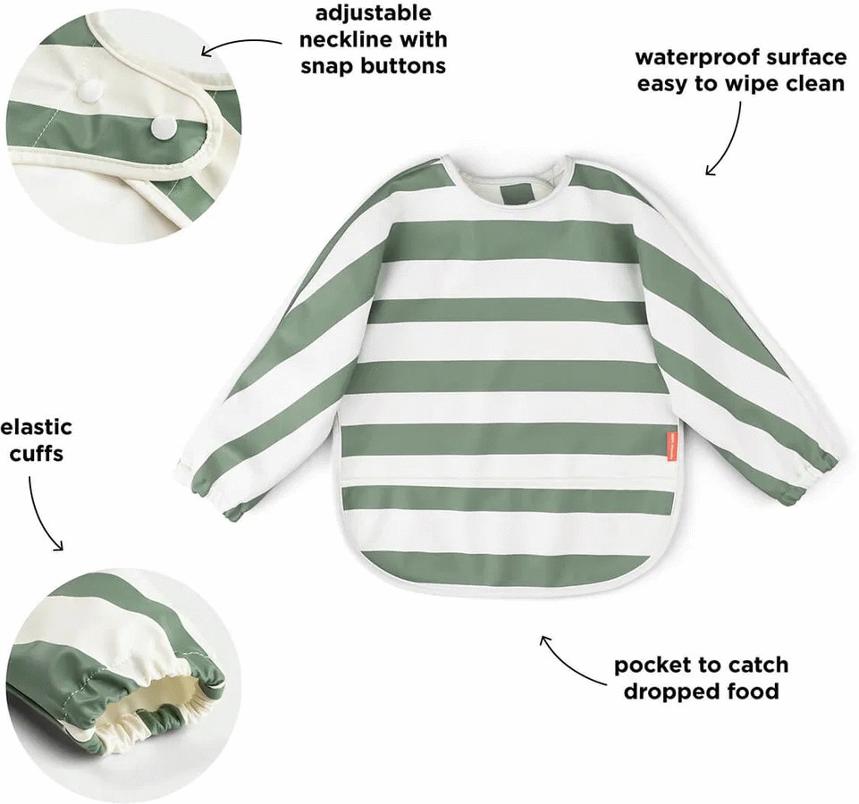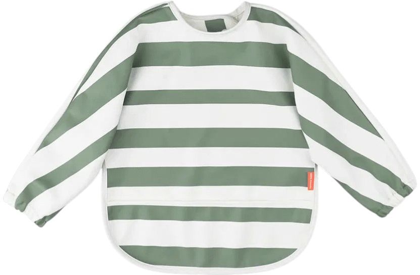 Done by Deer Stripes langærmet hagesmæk med lomme i grøn gør måltiderne lettere for både børn og forældre. Designet kombinerer praktisk funktionalitet med et moderne, stribet udtryk, der passer perfekt ind i hjemmet, hvor kvalitet og gennemtænkt design sættes i højsædet.Hagesmækken er udstyret med lange, elastiske ærmer, der holder barnets arme beskyttede under spisningen. Det betyder færre plamager på tøjet og mindre vask bagefter. Den vandtætte overflade gør det nemt at tørre smudset væk med en fugtig klud, så hagesmækken hurtigt er klar til næste måltid. Materialet er både slidstærkt og nemt at vedligeholde, hvilket gør den ideel til daglig brug.