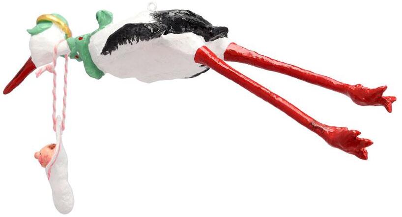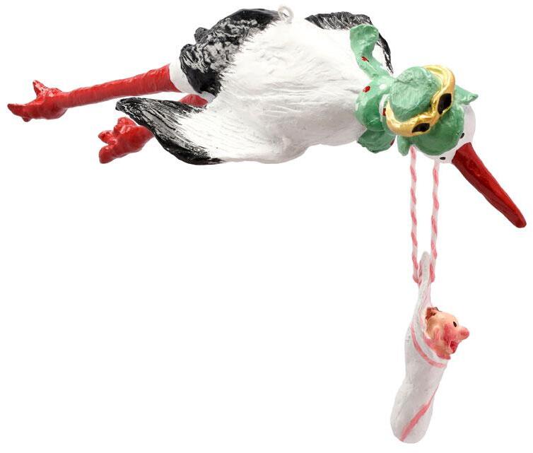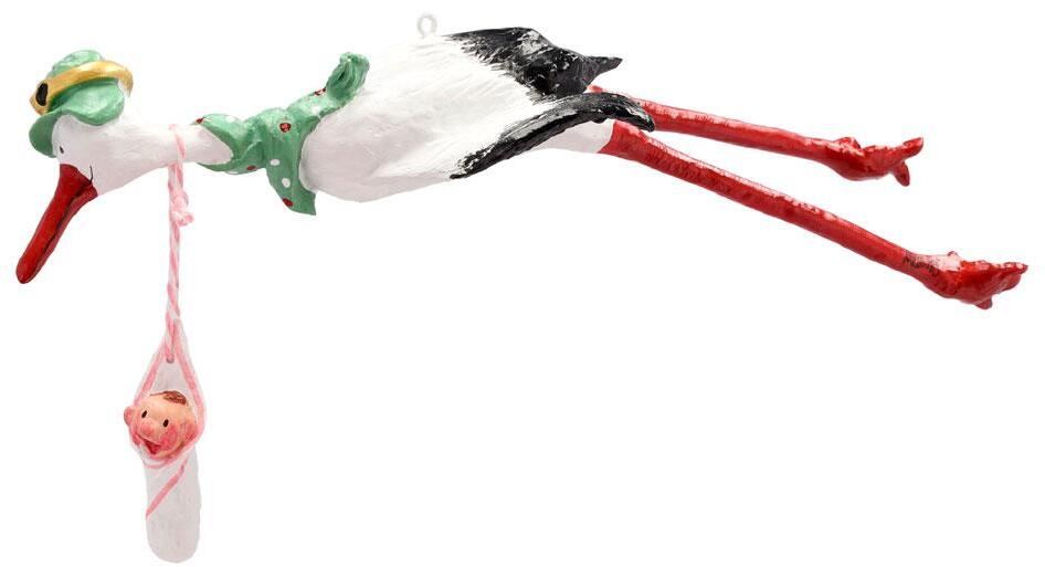 Storken Rasmus kommer stolt flyvende med en lille, nyfødt babypige. I en lyserød snor hænger babyen, som er svøbt i et tæppe med lyserød kant. Storken Rasmus er en sjov gaveide til babyshower, barselsgave, barnedåb eller navngivningsfest.