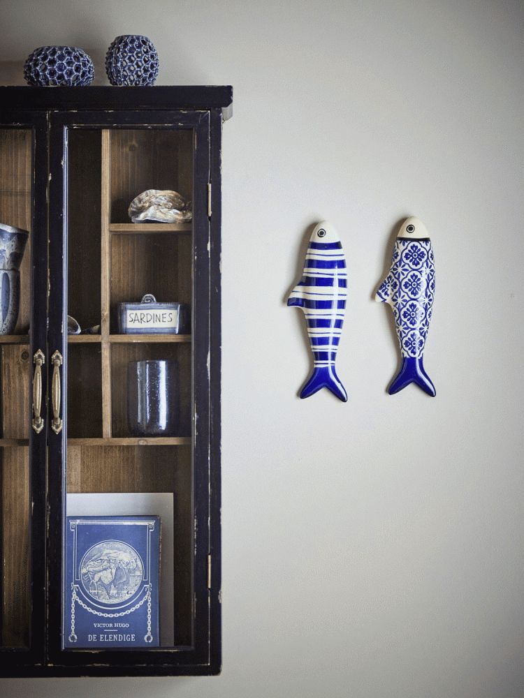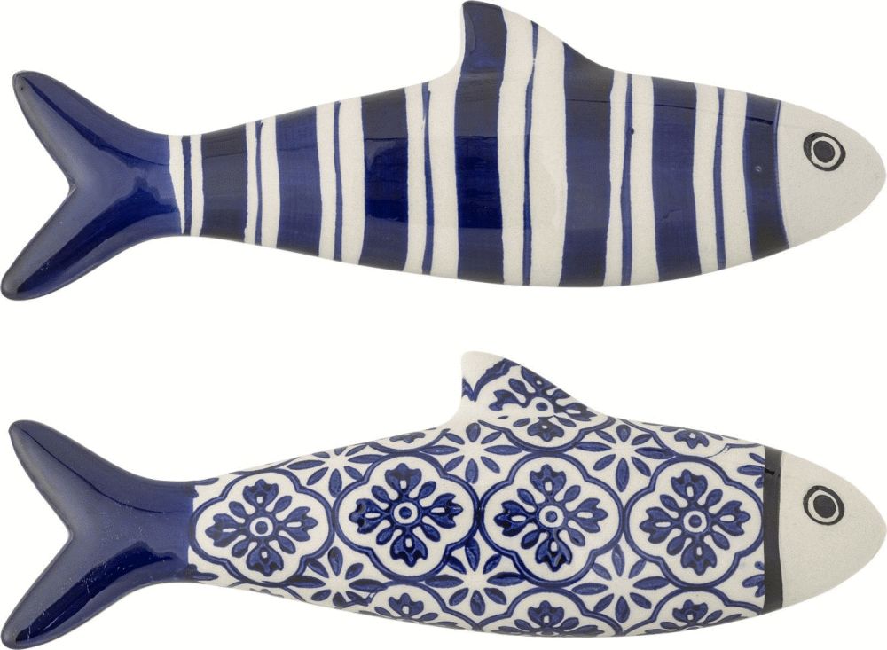 Dunne Vægdekorationen fra Creative Collection er et sæt med to fiskformede figurer i stentøj. Den ene har lodrette striber, mens den anden er dekoreret med fine blomsterdetaljer. I en blød blå nuance giver sættet et diskret grafisk præg til rummet.Længde: 26 cm