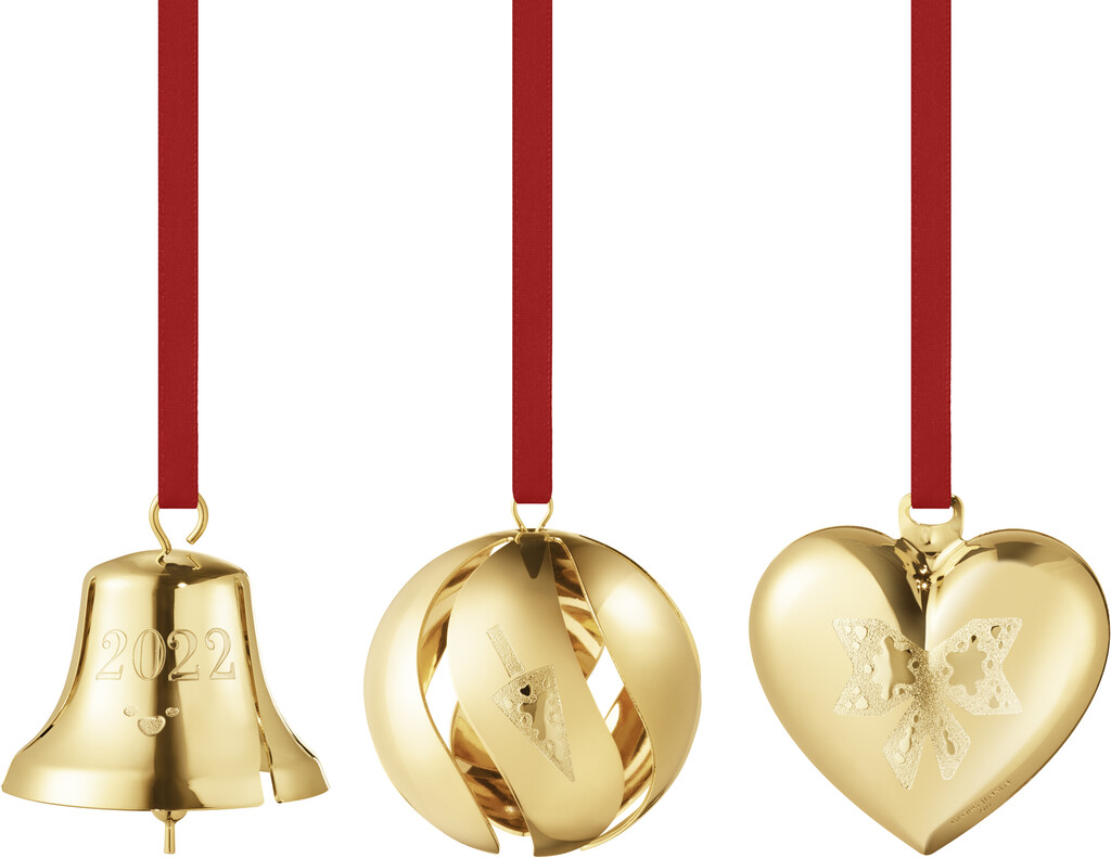 Dette sæt med samleobjekter med julen som tema fra 2022 består af de flotte ornamenter formet som en kugle, en klokke og et hjerte. Ornamenterne er omhyggeligt belagt med 18 kt. guld og leveres med to farvede bånd, det ene i årets særlige offwhite nuance, det andet i klassisk rød. Ornamenterne kan bruges som flotte dekorationer på træet såvel som mange andre steder.