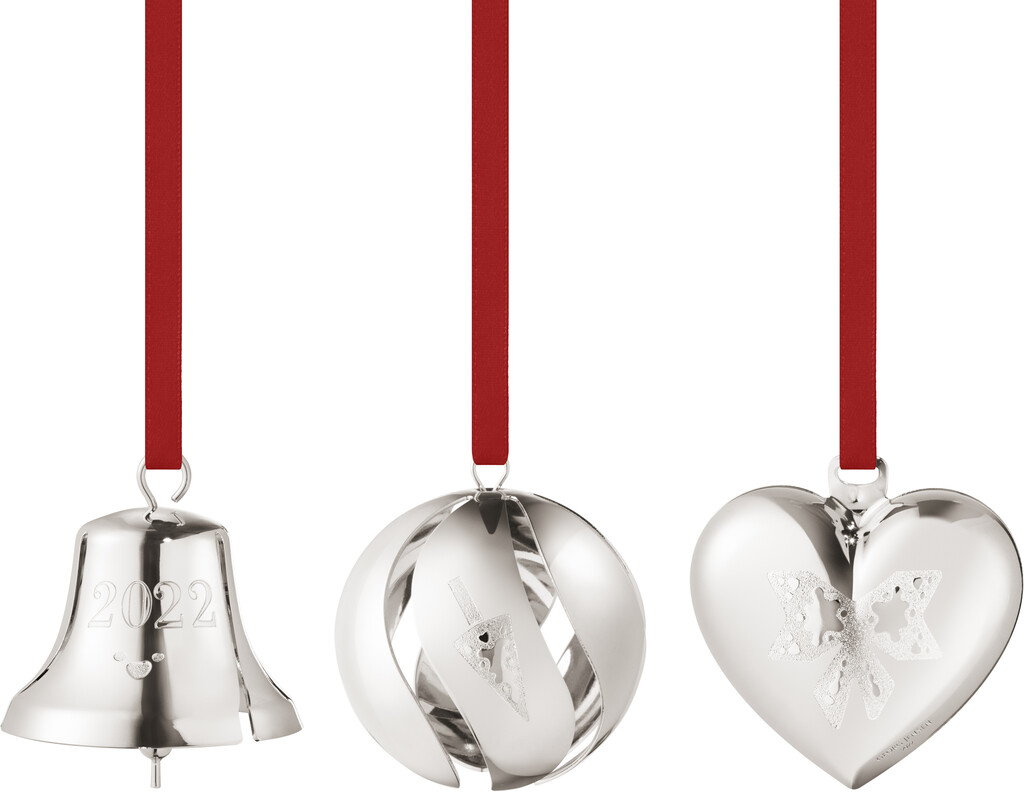 Dette sæt med samleobjekter med julen som tema fra 2022 består af de flotte ornamenter formet som en kugle, en klokke og et hjerte. De sølvfarvede ornamenter er omhyggeligt belagt med palladium og leveres med to farvede bånd, det ene i årets særlige offwhite nuance, det andet i klassisk rød. Ornamenterne kan bruges som flotte dekorationer på træet såvel som mange andre steder.