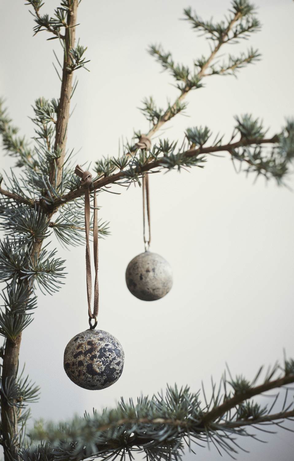 Ophængsystemet er gennemtænkt og elegant – en sort metalring forbundet med en lædersnor, som lader kuglen svæve frit og skabe et legende, charmerende udtryk. Dette simple, men effektive design gør det nemt at placere kuglerne præcis, hvor de ønskes, og de bevæger sig naturligt med luftstrømme i rummet.