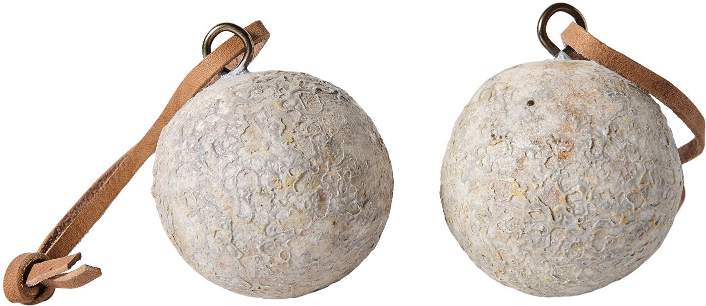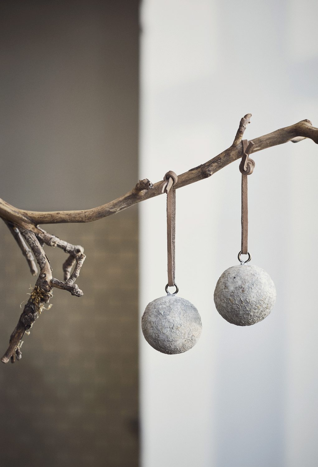 Ophængningssystemet består af en elegant sort ring forbundet med en lædersnor, der lader kuglen svæve frit og skabe et legende, næsten svævende udtryk. Dette gennemtænkte design gør det muligt at placere kuglerne på en naturlig gren fra stranden eller andre organiske elementer, hvilket skaber en personlig forbindelse til naturen året rundt.