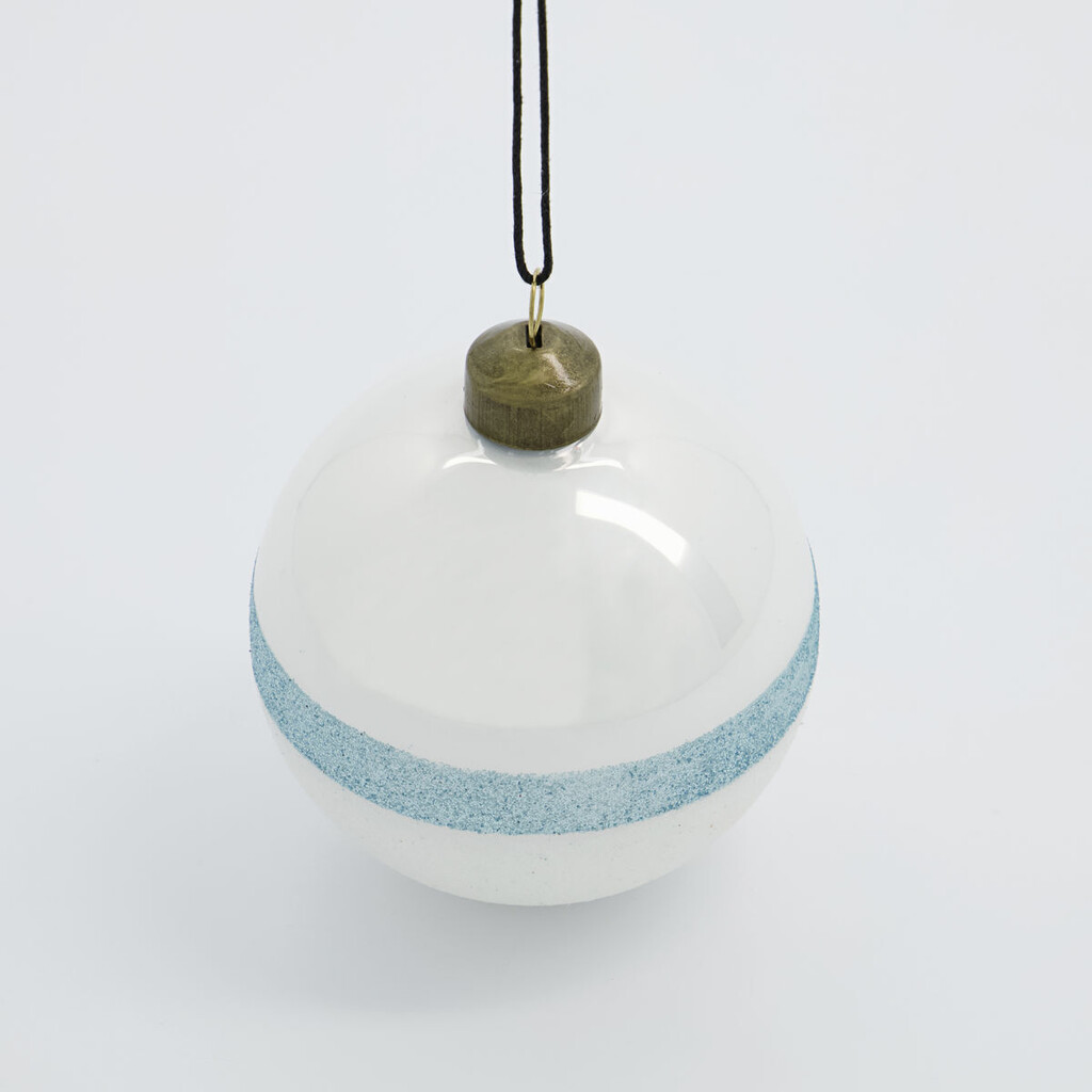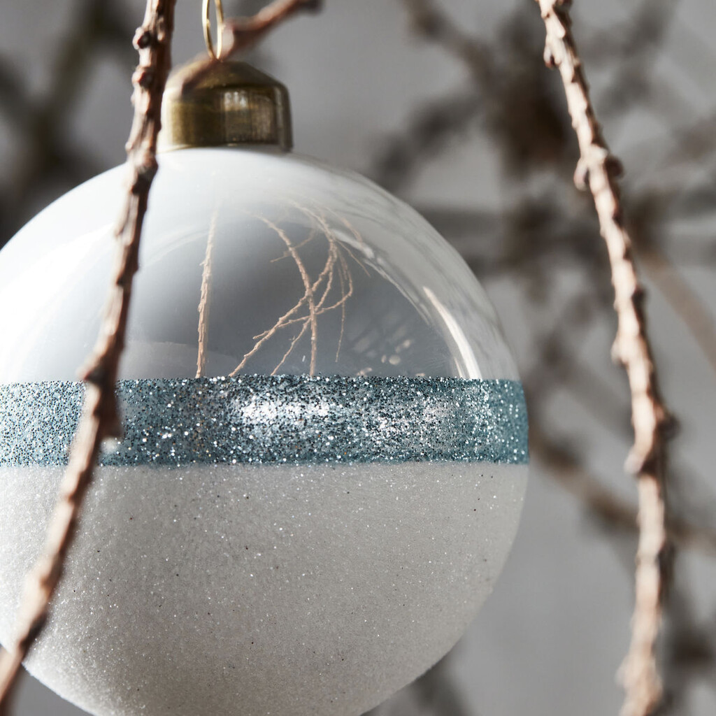 En vidunderlig blanding af forskellige teksturer gør denne stribede glasjulekugle særlig alsidig og elegant. Stripe fra House Doctor har subtile farver, der passer godt til enhver julepynt. Øverst er overfladen jævn, mens bunden er dyppet i hvid og lyseblå glimmer. Brug den stribede julekugle som et iøjnefaldende element mellem ensfarvet juleophæng, eller hold dig til glitter som et tema. Uanset hvad du vælger, passer juletræskuglen perfekt til enhver stilfuld og elegant juletræspynt.Mål: