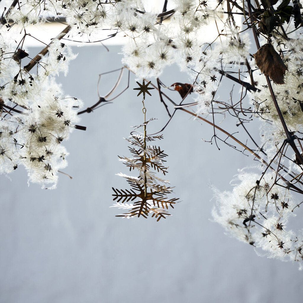 Dette sæt med tre små juletræer fra House Doctor er lavet af messing og dekoreret med en topstjerne. Du kan nemt bøje de enkelte grene og give juleophængene et 3D-look. De udstråler en vis lethed og kan derfor bruges som pynt mange steder i huset - på juletræet, på en gren i en gulvvase eller i dit vindue. Den klassiske guldfarve giver din julepynt et sofistikeret præg. Nyd den varme og hyggelige atmosfære, når juletræerne reflekterer lyset.Mål: