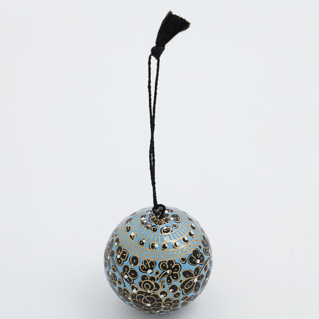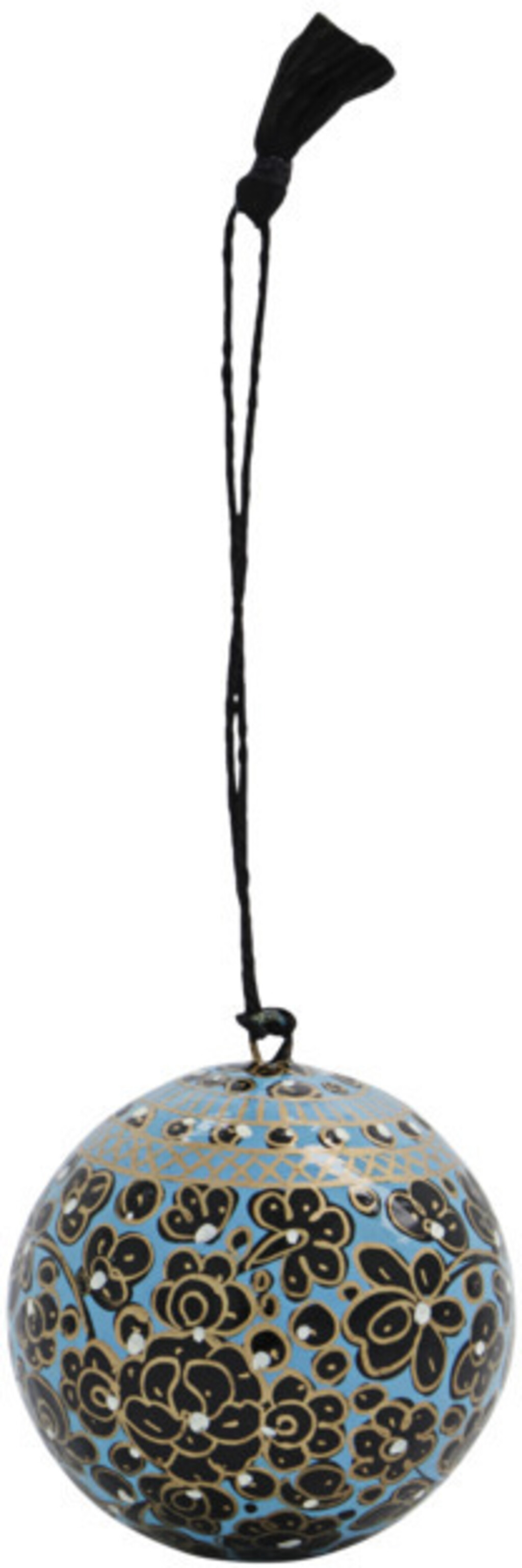 Forny din juletræspynt med en håndlavet julekugle af papmaché fra House Doctor. Mache tilføjer et levende udtryk med sit komplekse blomstermønster i sort, blå og guld. En afvigelse fra traditionelle julekugler, men alligevel med farver, som både er festlige og nemme at kombinere. Hæng kuglen på dit juletræ og pynt som du vil. Med lignende nuancer, en smuk blanding af materialer eller ensfarvede ornamenter for at få kuglen til at skille sig ud. Den vil også pynte flot sammen med en lysestage på en dekorativ bakke på middagsbordet.Mål: