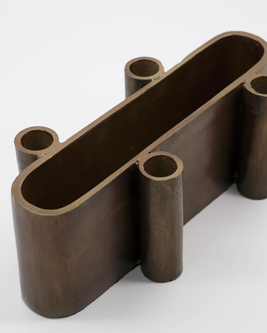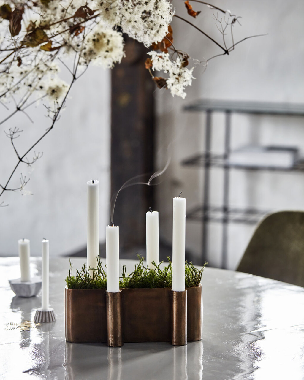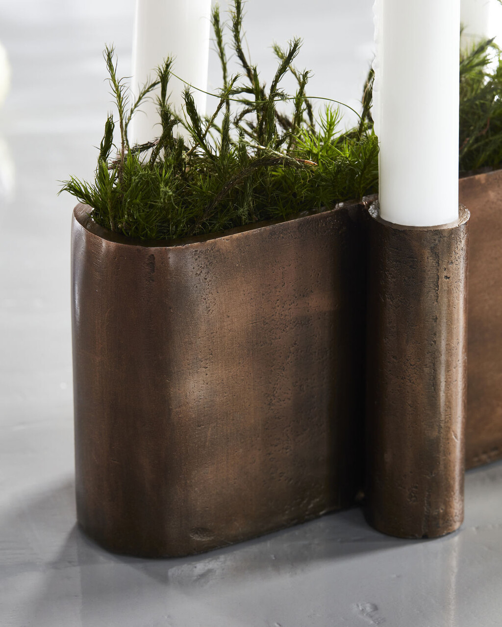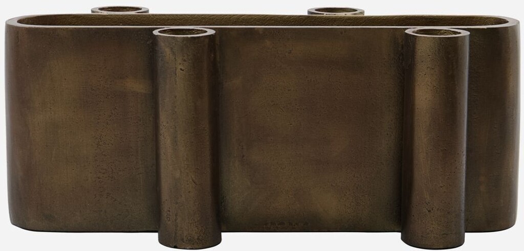 Lad denne ovale lysestage fra House Doctor være midtpunktet på dit julebord. Den er lavet af aluminium med en rustik finish, som giver den et industrielt udtryk. Den klassiske, gyldne nuance skaber balance og giver dig en lysestage, som også kan bruges i tiden efter jul. Brug Four akkurat som du vil – med eller uden ekstra pynt. Tilføj blot stagelys for et minimalistisk og tidløst udtryk, som passer ind i enhver boligindretning. Du kan også pynte med små julekugler, en guirlande eller andet julepynt i midten, så lysestagen bliver personlig og festlig at se på. Passer til lys med en diameter på 2 cm.Mål: