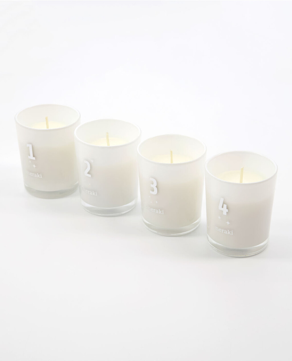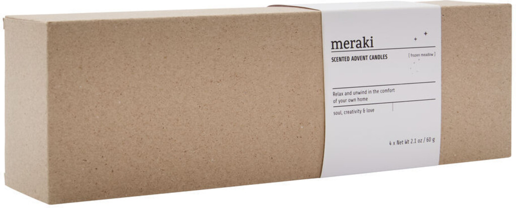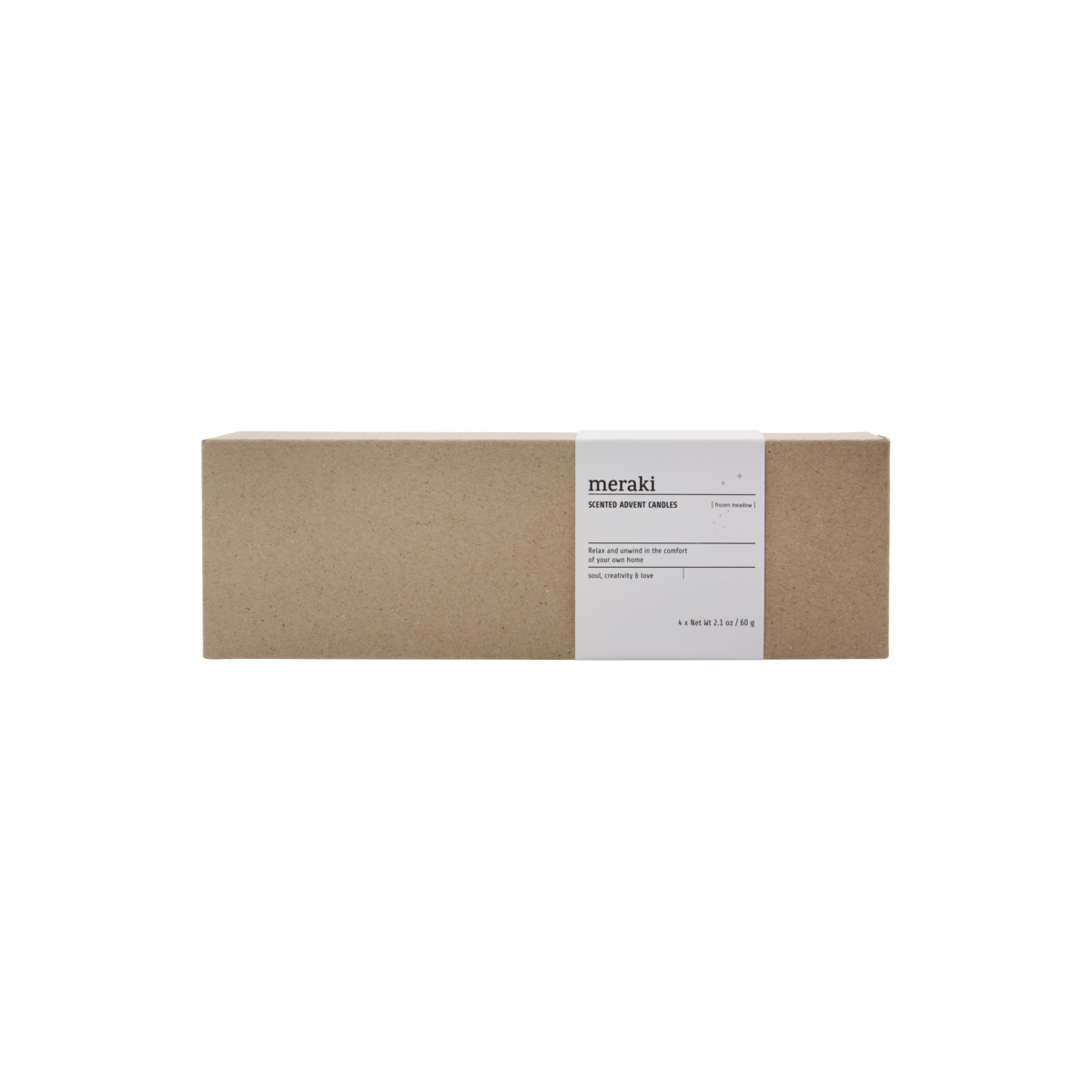 Duftlys fra Meraki skaber velvære og spreder en rolig og afslappende atmosfære. Forær den oplevelse til din ven eller én, du holder af, med disse fire duftende adventslys. Sættet hedder Frozen Meadow og er beriget med en varm duft af græskar. Tæl ned til juleaften ved at tænde et lys på hver af de fire søndage før jul. Det hvide glas afspejler årstiden og sætter den rette stemning til lidt velfortjent selvforkælelse. Brug duftlysene i stuen eller på badeværelset til at skabe en hyggelig og fredfyldt atmosfære.Mål: