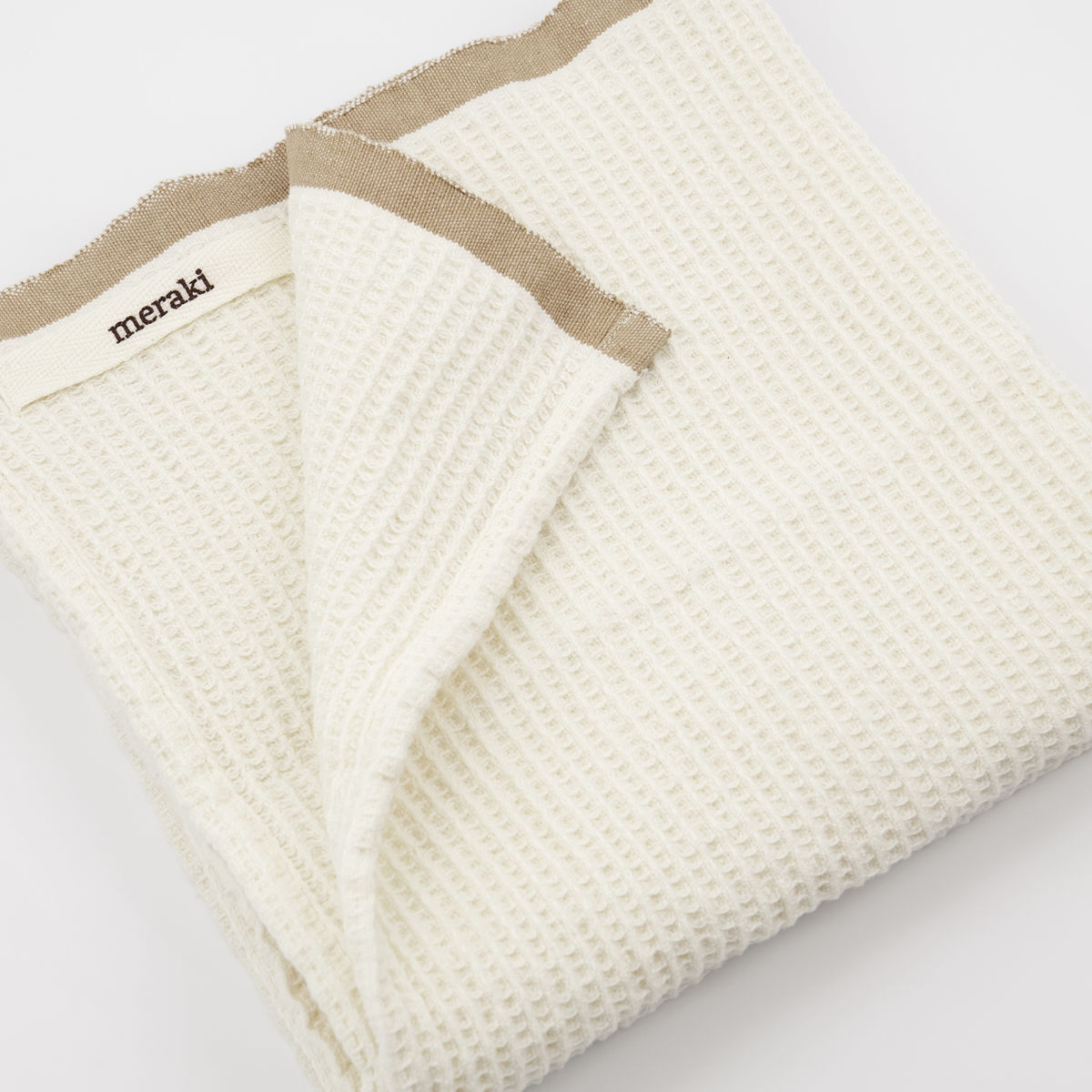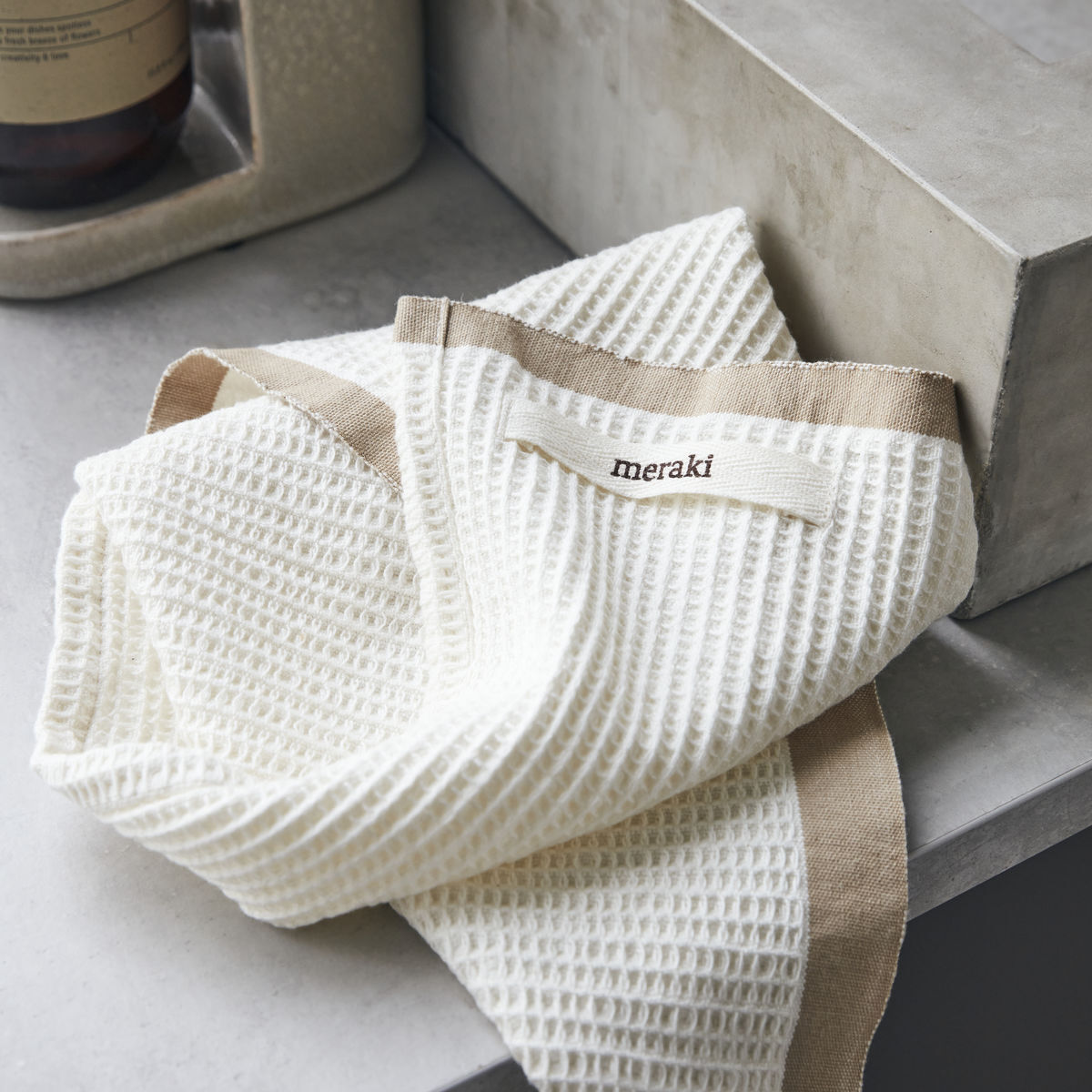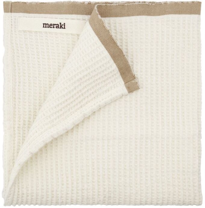 Et sæt med 2 køkkenhåndklæder i et opgraderet design. Bare fra Meraki er både praktiske med det absorberende og bløde bomuld, og stilfulde med deres vaffelmønster og sandfarvede kant. Hæng dem på en krog nær køkkenvasken og brug dem til at tørre hænder efter opvasken eller tørre køkkenbordet. Fuldend det rolige og naturlige udtryk ved at tilføje karkludene i samme design. Selv om køkkenhåndklæder er en hverdagsting, vi tager for givet, er de alligevel vigtige elementer i at skabe det fuldendte udtryk i dit køkken.Længde: 50 cm