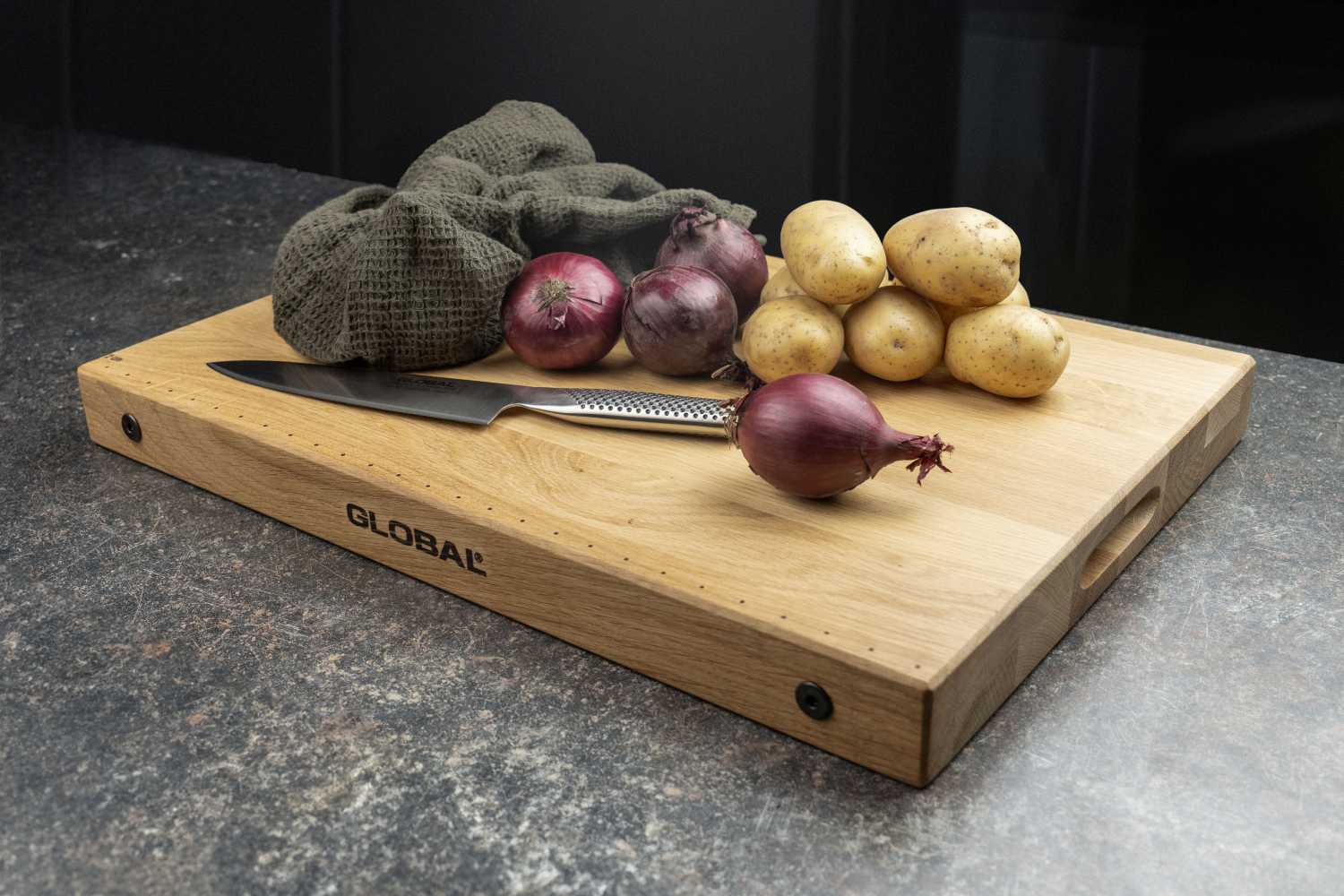 Global Skærebræt 55 cm i Eg - et holdbart fundament for din madlavningDette skærebræt fra Global er skabt med den professionelle kok og madentusiast i tankerne. Fremstillet af sølveg, en træsort der er særligt velegnet til skærebrætter, giver dette 55 cm store skærebræt den perfekte balance mellem hårdhed og skånsomhed mod dine knive. Sølvegens naturlige egenskaber med tætte fibre og små porer sikrer et hygiejnisk skærebræt, der samtidig beskytter dine knivsægge mod unødig slitage.