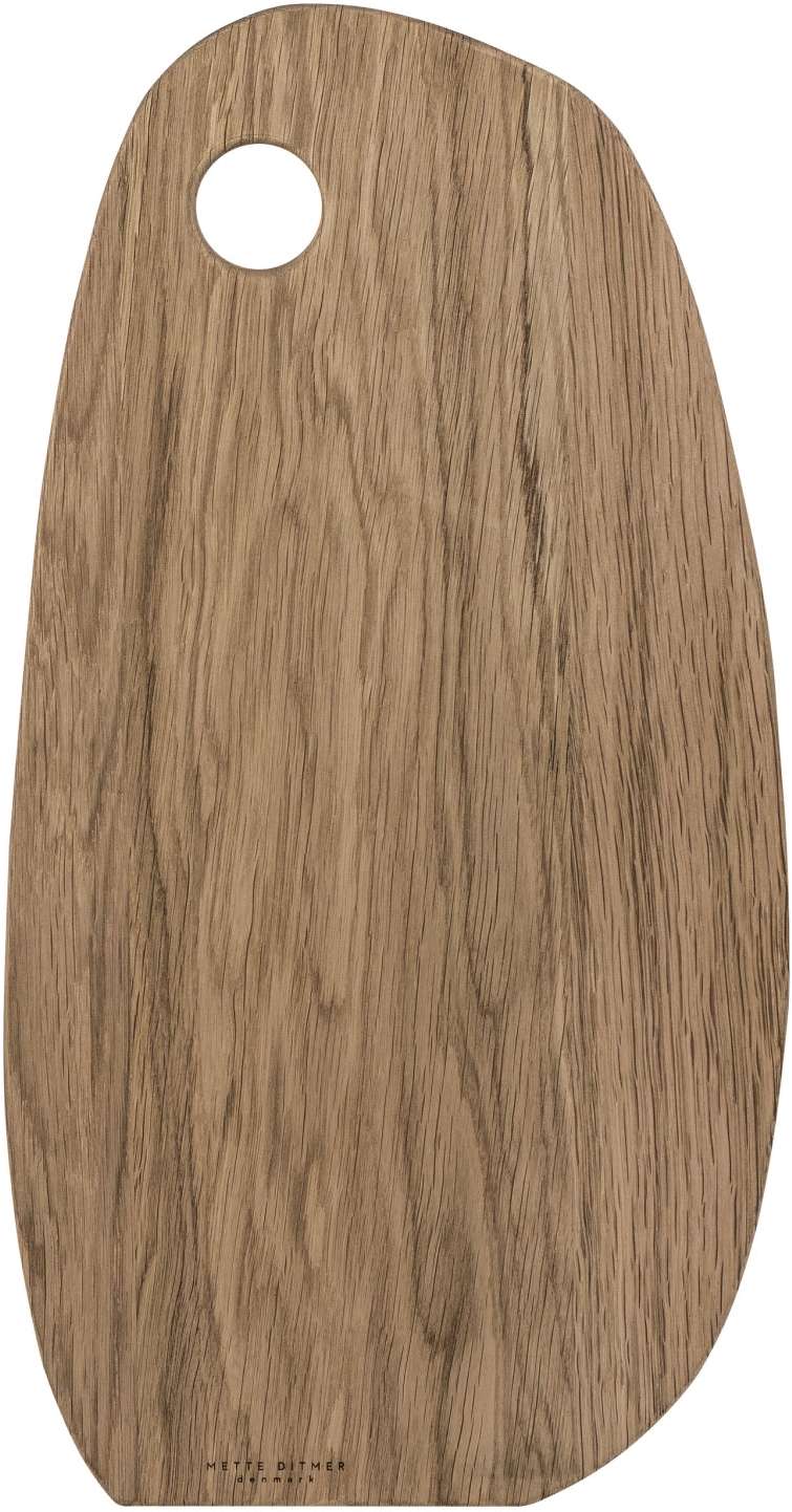 Det store AUTHENTIC skærebræt i massivt egetræ udmærker sig ved sin organiske form og naturlige udstråling. Den fødevaresikre oliebehandling fremhæver egetræets varme farvetone og tydelige årestruktur. Et hul til ophæng og en afskåret bund gør det nemt at opbevare eller lade brættet stå elegant op ad væggen, når det ikke er i brug. Velegnet til udskæring af grøntsager, brød eller til anretning af ost og tapas. Den generøse størrelse og solide konstruktion gør brættet både praktisk og dekorativt. For at bevare gløden og holdbarheden anbefales det at give overfladen lidt rapsolie efter behov.Vask i hånden, aftørres med viskestykke. Vi anbefaler alm. opvaskemiddel. Produktet er ikke egnet til opvaskemaskinen.Længde: 44 cm
