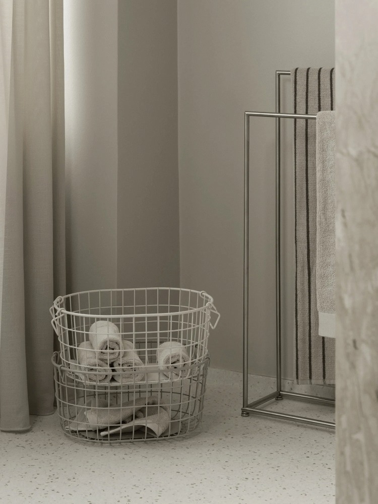 Kurven er fremstillet i pulverlakeret metal i den elegante farve Mourning Dove, som tilføjer en diskret og tidløs karakter til ethvert rum. Den karakteristiske konstruktion med varierende afstand mellem stiverne giver kurven en luftig og sofistikeret æstetik, der skiller sig ud fra traditionelle opbevaringsløsninger. Dette gennemtænkte design skaber et visuelt interessant udtryk, mens det samtidig sikrer kurvens stabilitet og holdbarhed.