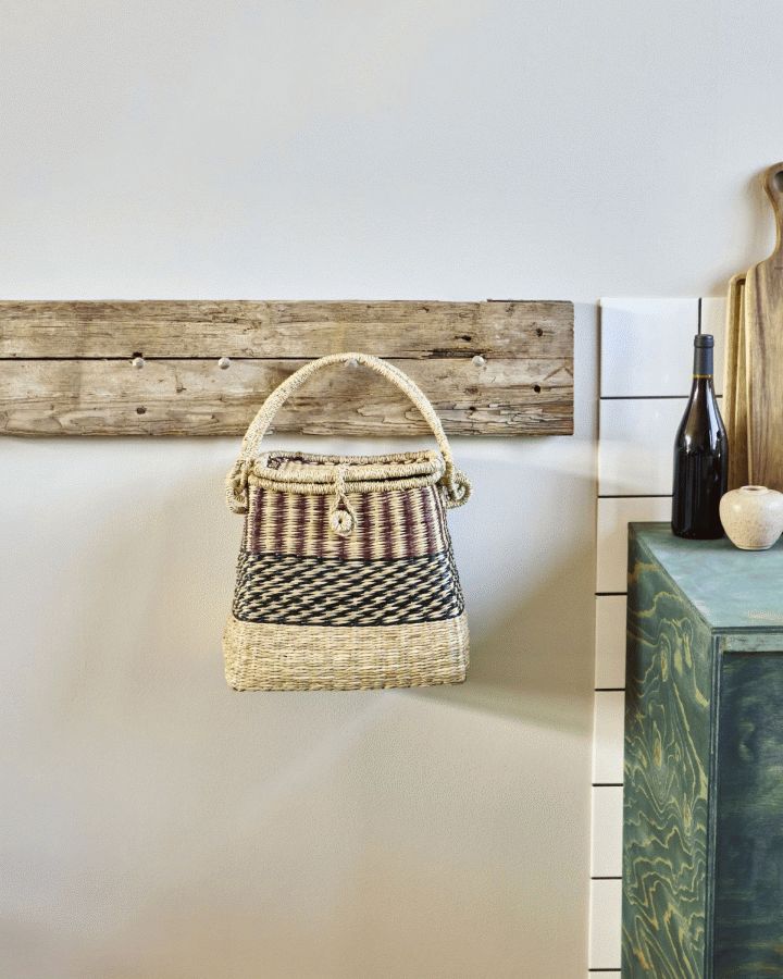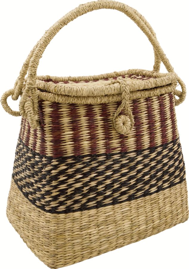 Kurven er fremstillet i håndflettet søgræs, hvor hver eneste fiber er omhyggeligt vævet sammen af dygtige håndværkere. Denne traditionelle fremstillingsmetode sikrer, at hver kurv bliver unik med sine egne karakteristiske detaljer. Det geometriske mønster i naturlige, rødlige og brune nuancer skaber en visuelt interessant overflade, der passer smukt ind i både moderne og klassiske interiører.