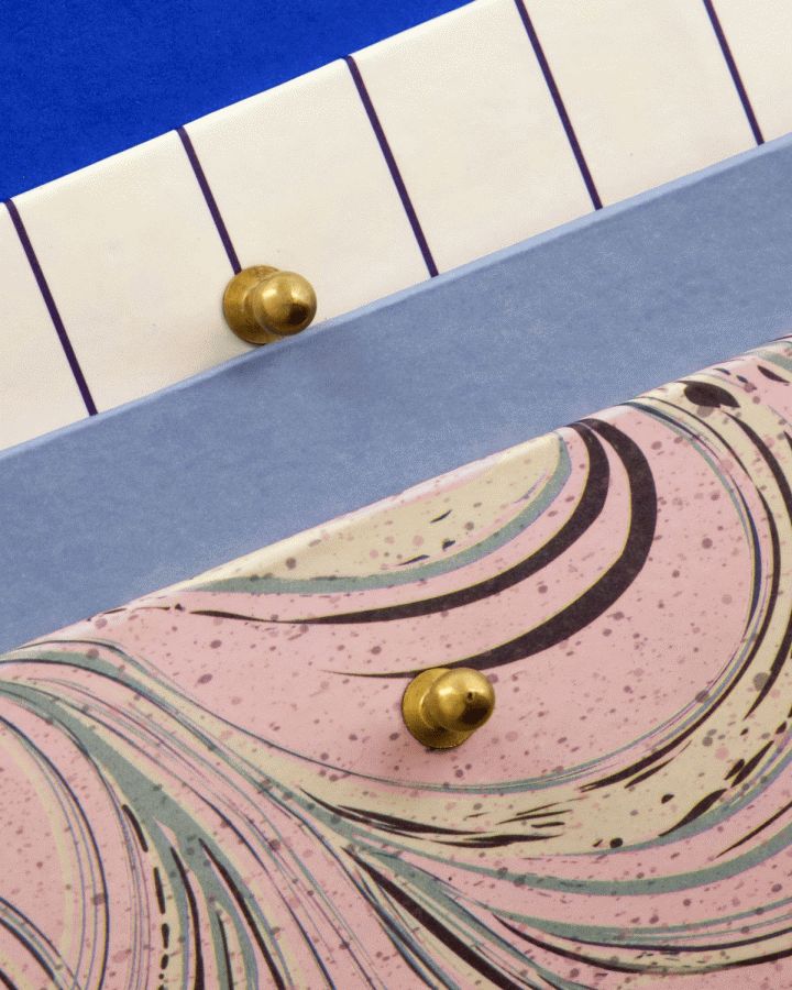 Hver kasse er fremstillet primært af papir, som udgør 95% af materialet, suppleret med detaljer i guldbelagt finish og gummi. Denne kombination sikrer både holdbarhed og et raffineret visuelt udtryk. Det guldbelagte element tilføjer et diskret touch af elegance, der løfter kassernes æstetik uden at dominere.