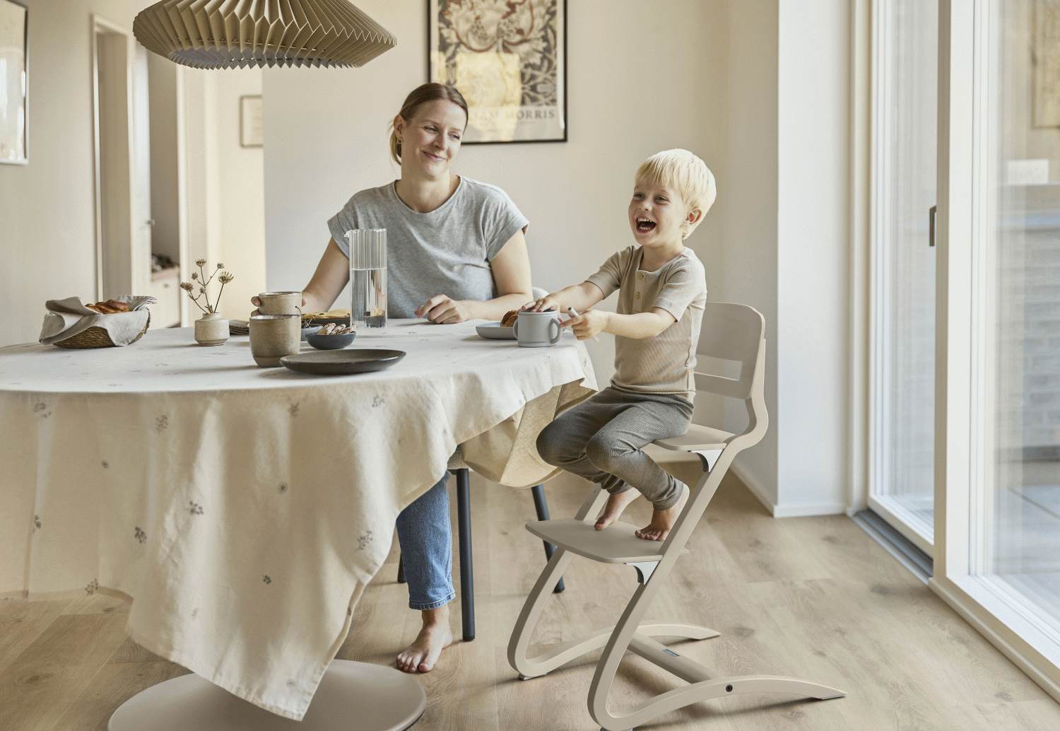 De elegant buede ben giver stolen både stabilitet og et visuelt let udtryk. Designet gør højstolen nem at bære og flytte rundt på, hvilket er praktisk i en travl hverdag. Benenes udformning sikrer, at det er let at bevæge sig omkring stolen, når der skal gøres rent eller ryddes op.