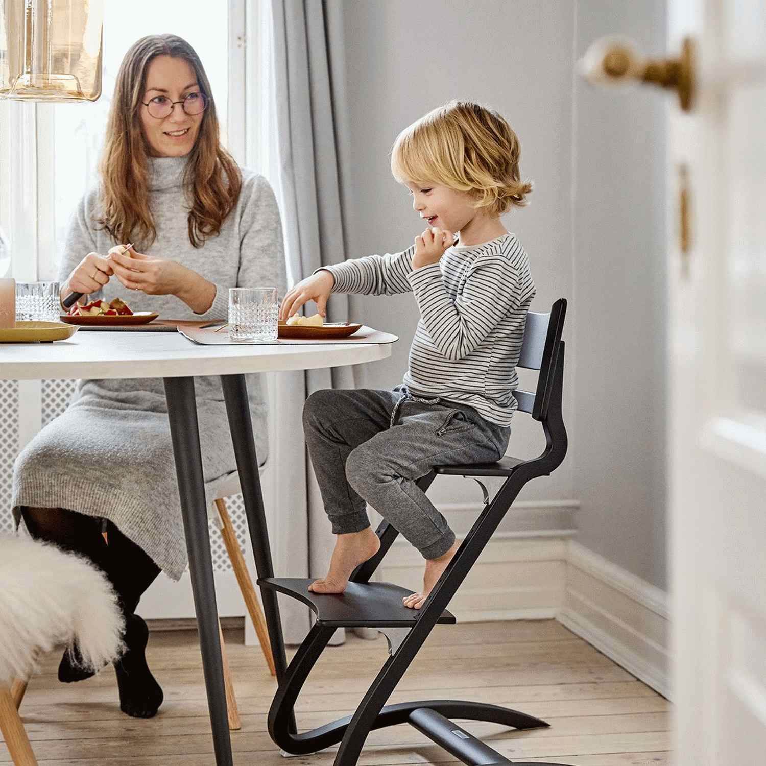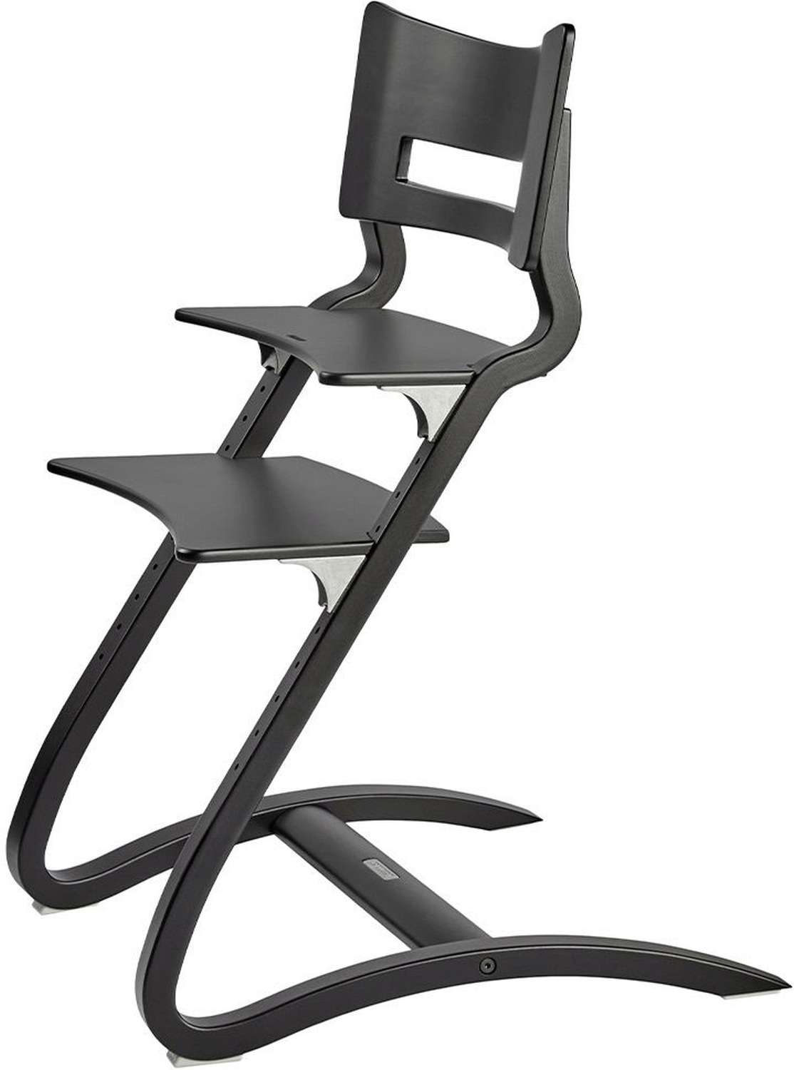 Den sorte finish giver højstolen et moderne og stilrent udtryk, der nemt matcher forskellige indretningsstile. Farven er praktisk i hverdagen og holder godt til daglig brug.