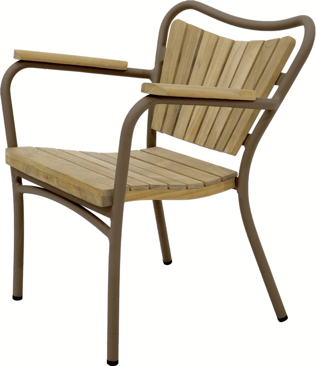 Stolen kombinerer sæde, ryg og armlæn i massiv teak med et pulverlakeret aluminiumsstel i en smuk mocca-farve. Farvevalget er afdæmpet og blødt i udtrykket – en dyb mocca-nuance, der harmonerer smukt med både teakens gyldne glød og den sølvgrå patina, træet naturligt udvikler over tid. Den neutrale farvetone passer ind i de fleste indretninger og skaber en sammenhængende helhed i uderummet.