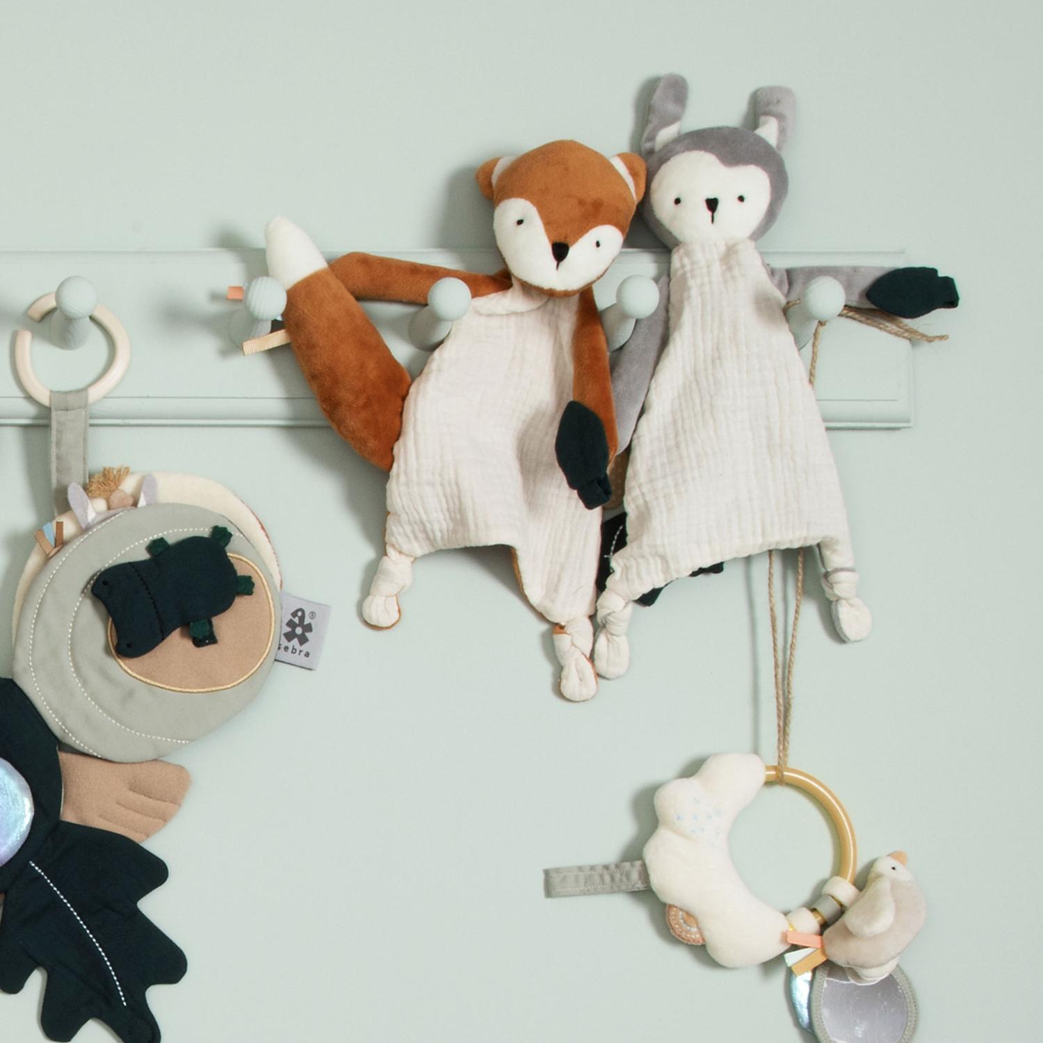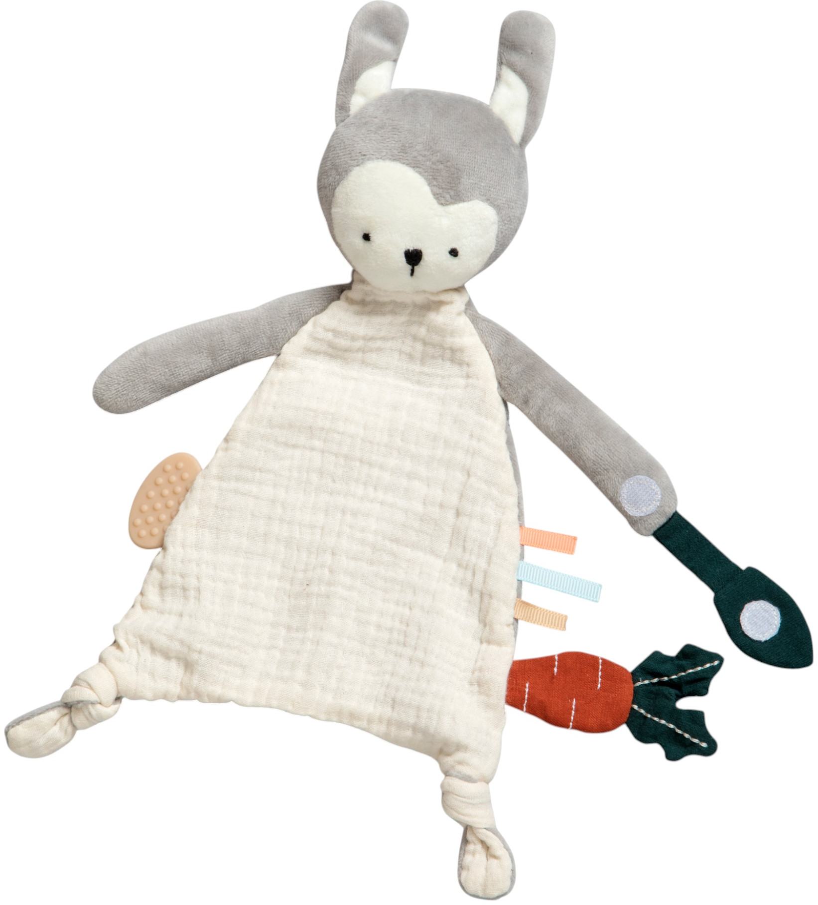 Den bløde sutteklud kan hurtigt blive en uundværlig bamse, som skaber tryghed og genkendelighed både ved sovetid, hyggestunder og når der er brug for trøst. Forskellige teksturer og er-tags giver barnet mulighed for sansestimulering når taktiliteten skal udforskes og mærkes. Mærkerne har forskellige farver, så der også er lidt for synssansen. Bideringen, som sidder på kaninens ene side, stimulerer og lindrer kløende gummer - især ved tandfrembrud. En velcro-lukning gør, at der kan sættes en sut fast på nussekluden, så den ikke bliver væk eksempelvis hvis barnet har kluden med på tur - i indkøbsvognen, autostolen eller barnevognen. - når barnet mærker teksturer, blødhed og hårdhed samt forskellige materialer. - når barnet oplever farver og teksturer. - når barnet bider i eller sutter på produktet og mærker elementerne smager / føles forskellige. - når barnet griber fat om produktet og senere hen udforsker de forskellige er-tags.Længde: 14 cm
