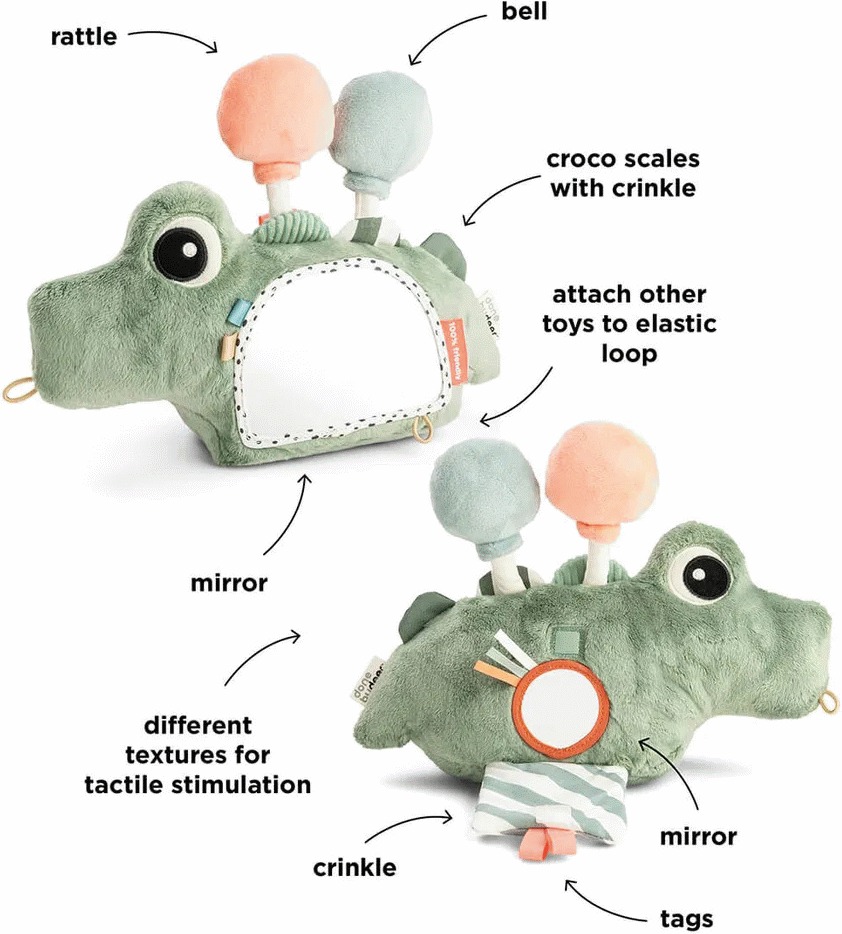 De interaktive elementer på krokodillen er omhyggeligt udvalgt for at stimulere barnets sanser på flere niveauer. Forskellige teksturer inviterer til berøring og udforskning, mens små lyde og visuelle detaljer holder interessen ved lige. Hver eneste funktion er tænkt ind i designet for at skabe en rig sensorisk oplevelse, der understøtter barnets naturlige udvikling og læring gennem leg.