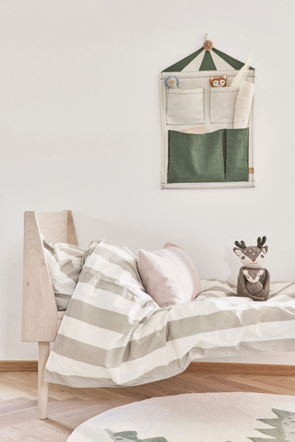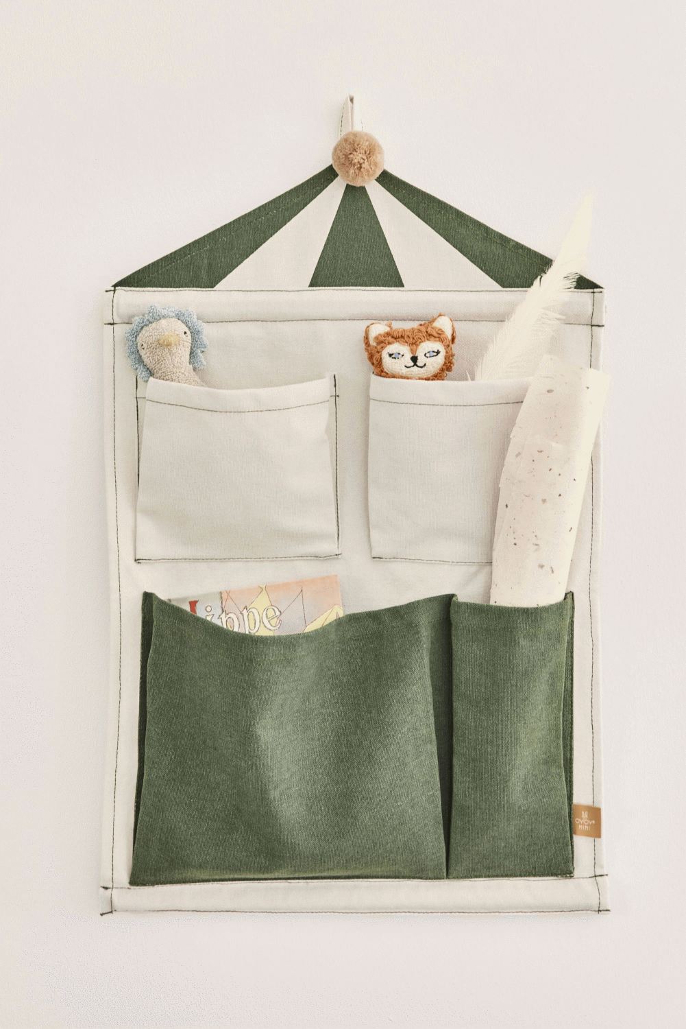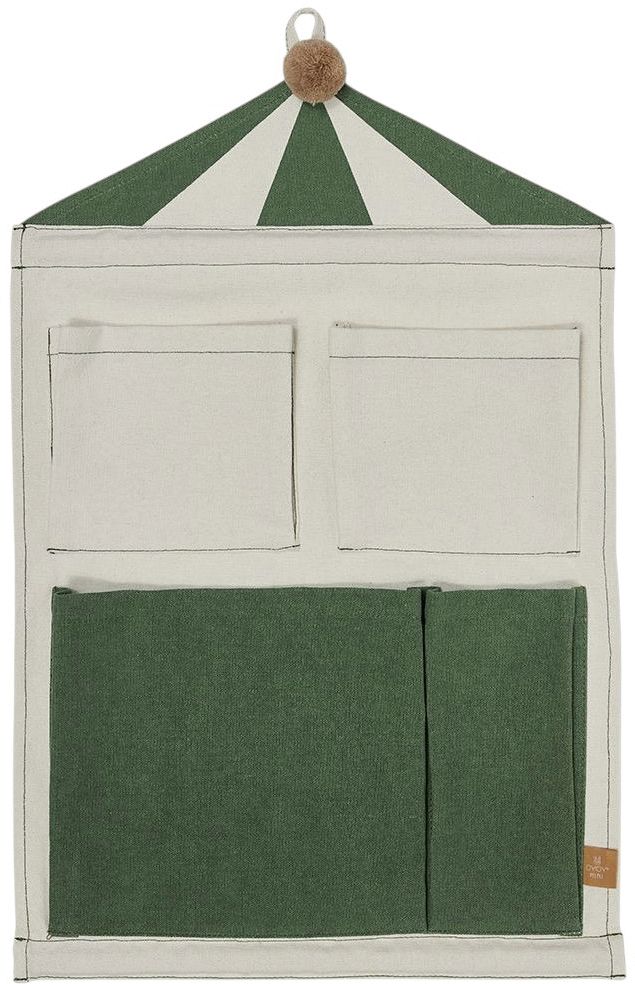 Vægopbevaringen er udformet som et stiliseret cirkustelt i de smukke farver clay og grøn, der passer perfekt ind i moderne børneindretning. De mange påsyede lommer i forskellige størrelser gør det nemt at organisere alt fra bøger og tegneblokke til små legetøjsfigurer og kreative materialer. Hver lomme er strategisk placeret for at maksimere både tilgængelighed og æstetisk balance.