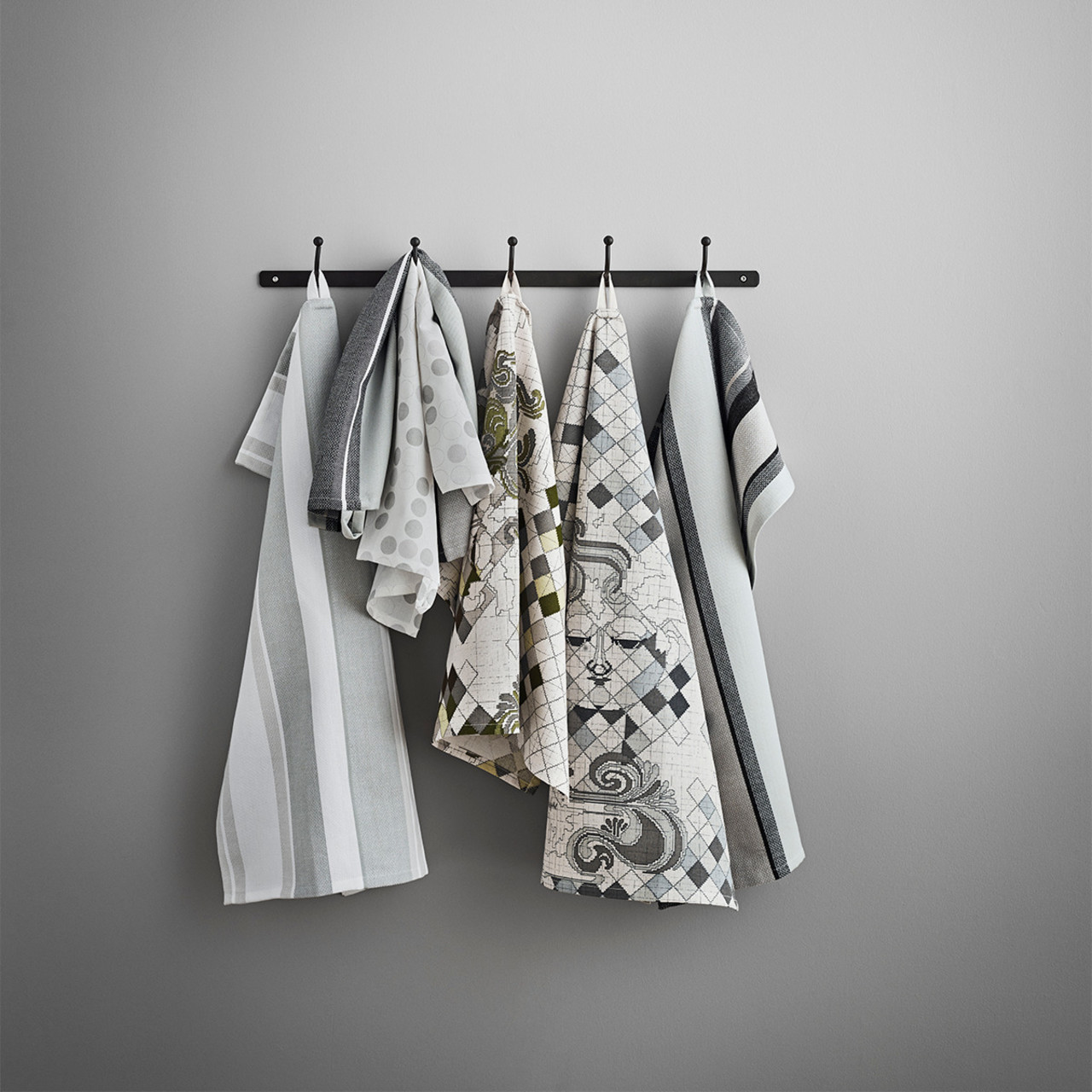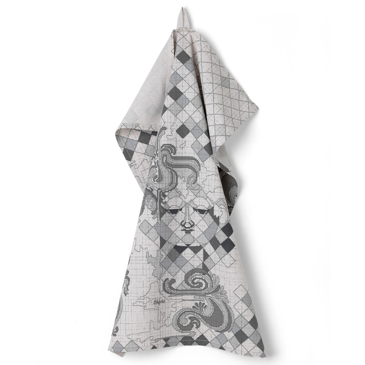 Dette smukke viskestykke fra JUNA har print fra Bjørn Wiinblads karakteristiske gobelindesign. Det er lavet af 100 % bomuld og suger godt. Viskestykket tåler både maskinvask og tørretumbler. Viskestykket kæler for detaljerne med det kunstneriske kvindeansigt, der prydes af et flot, omgivende mønster. Viskestykket fremstår i kølige grå farver i forskellige nuancer. Det passer derfor flot til mange hjem.Serie:Bjørn Wiinblad