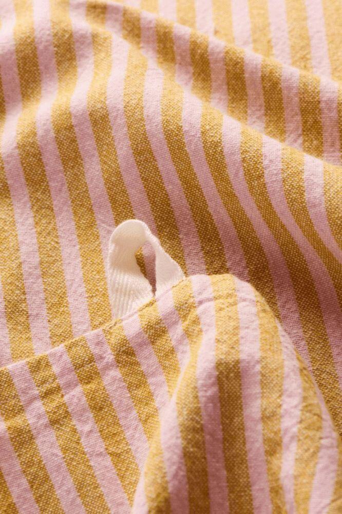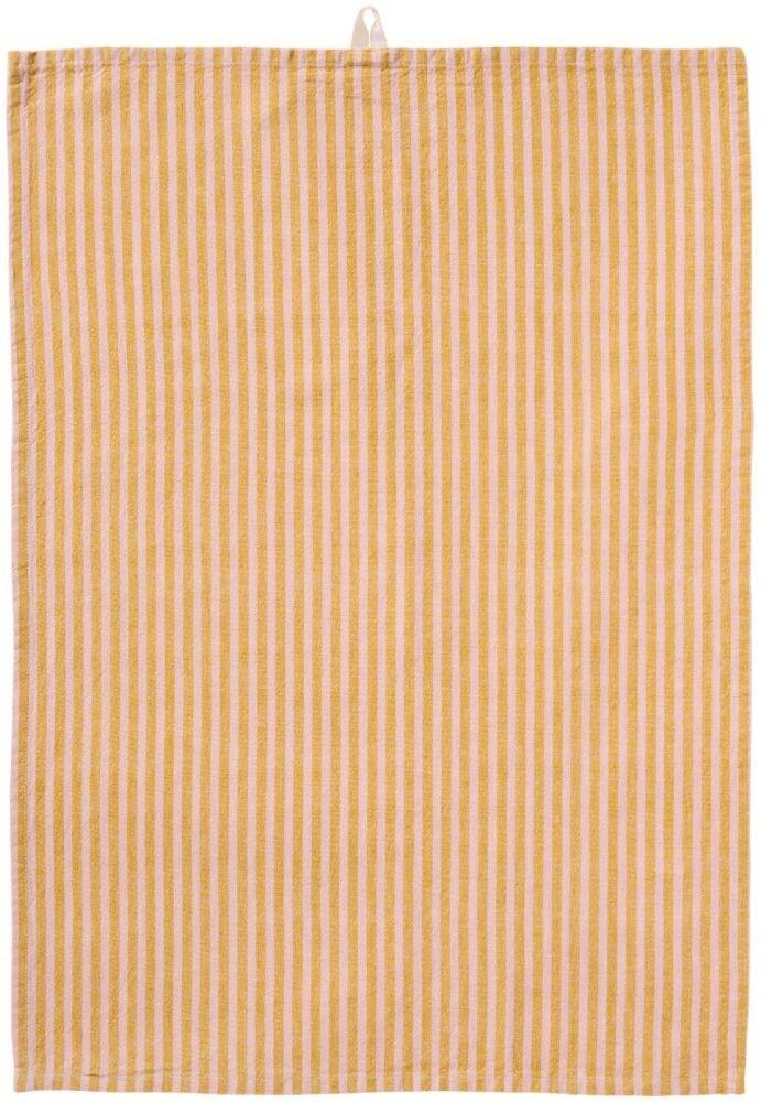 Farvekombinationen af mustard og lyserød tilfører et moderne og livligt touch til køkkenet, mens den samtidig harmonerer smukt med både klassiske og samtidige indretningsstiler. Dette viskestykke fungerer ikke blot som et funktionelt redskab, men også som et dekorativt element, der kan hænge synligt i køkkenet som en del af den samlede æstetik.