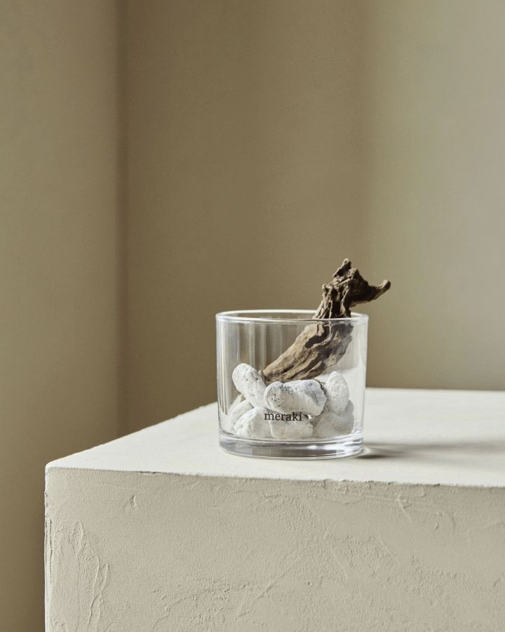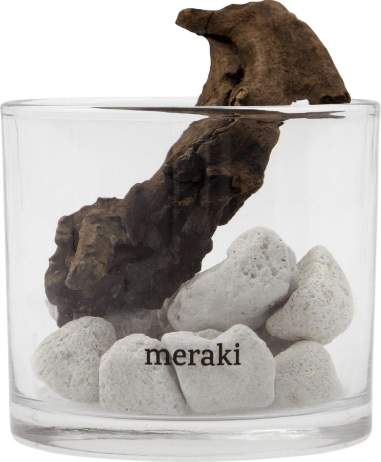 Denne duftfrisker fra Meraki forener naturlige materialer med nordisk designæstetik i en harmonisk helhed. Det klare glas danner rammen om en sammensat kombination af hvide lavasten og stykker af drivtømmer, der sammen skaber et visuelt udtryk præget af naturens egne former og teksturer.Funktionen er lige så gennemtænkt som designet. Lavastenenes porøse overflade gør dem ideelle til at optage og langsomt frigive æteriske olier. Når du tilsætter et par dråber af din foretrukne olie på stenene, vil duften gradvist sprede sig i rummet og skabe en behagelig atmosfære. Drivtømmerets naturlige patina bidrager til det organiske udtryk og understreger produktets forbindelse til naturen.