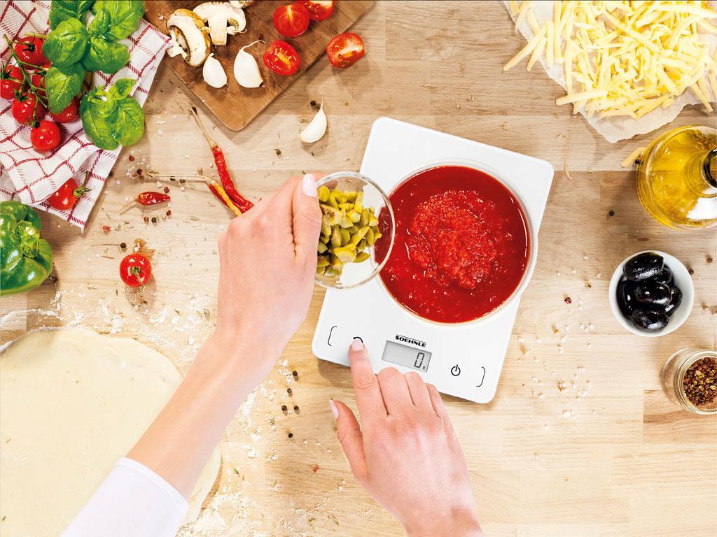 Køkkenvægt i kompakt og ekstra tyndt design, 20 x 15 x 1,3 cm. Vejer op til 5 kg med interval på 1 g, hvilket gør den ideel til fx krydderier. Letlæseligt display, tarafunktion og energisparende autosluk-funktion. Enhederne vises i g/kg eller oz/lb.