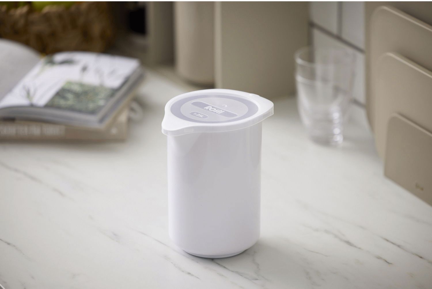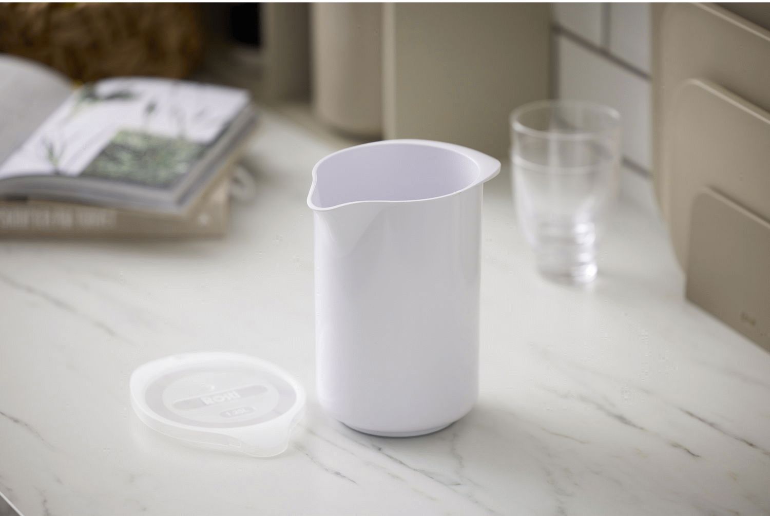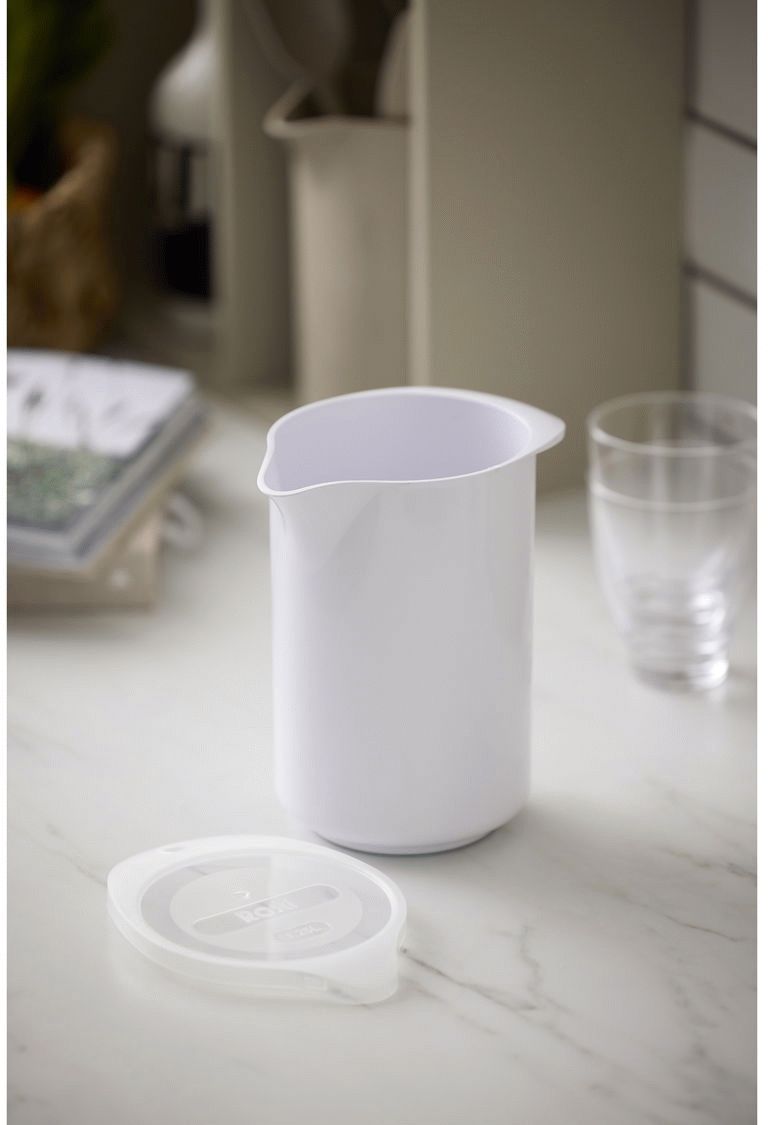 Det medfølgende låg gør kanden særligt praktisk til opbevaring i køleskabet, hvor indholdet holdes friskt og beskyttet. Låget sikrer også, at kanden kan bruges til at blande og ryste ingredienser uden at spilde. Det hvide design passer naturligt ind i ethvert køkken og komplementerer anden køkkenudstyr, uanset om du foretrækker et klassisk eller moderne udtryk.