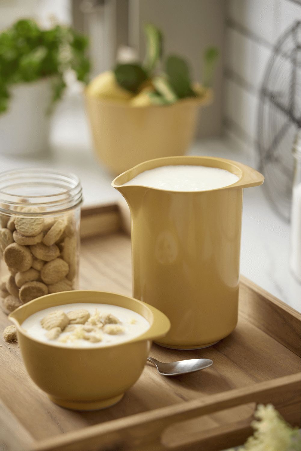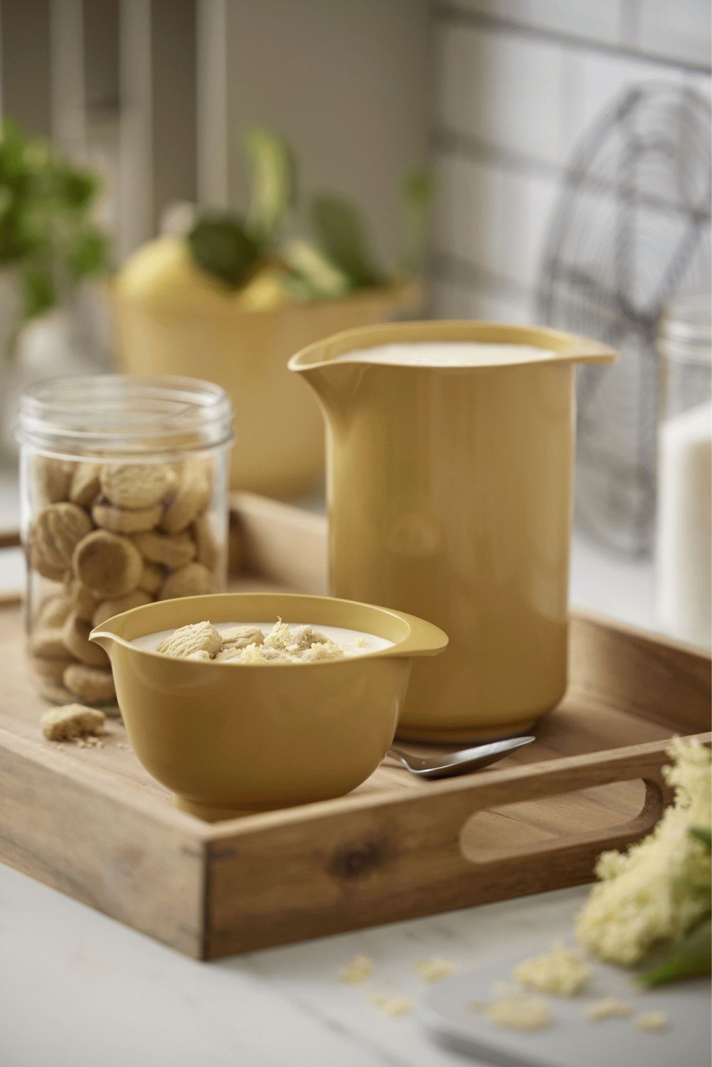 Rosti Classic Mixkande i curry-farven bringer tidløs funktionalitet og skandinavisk design til dit køkken. Denne 1,25 liters kande er skabt som en naturlig ledsager til den ikoniske Margrethe-skål og deler samme designsprog og farvepalette, hvilket giver dit køkkenudstyr et harmonisk udtryk.Den gennemtænkte udformning med et komfortabelt greb og præcis hældetud gør kanden utrolig alsidig i køkkenet. Hvad enten du pisker flødeskum til desserten, blander en lækker smoothie eller serverer forfriskende hjemmelavet limonade, leverer denne mixkande perfekt funktionalitet hver gang.