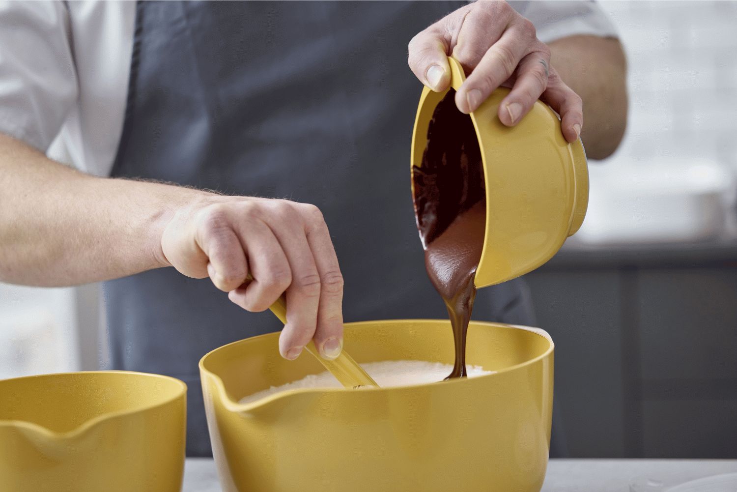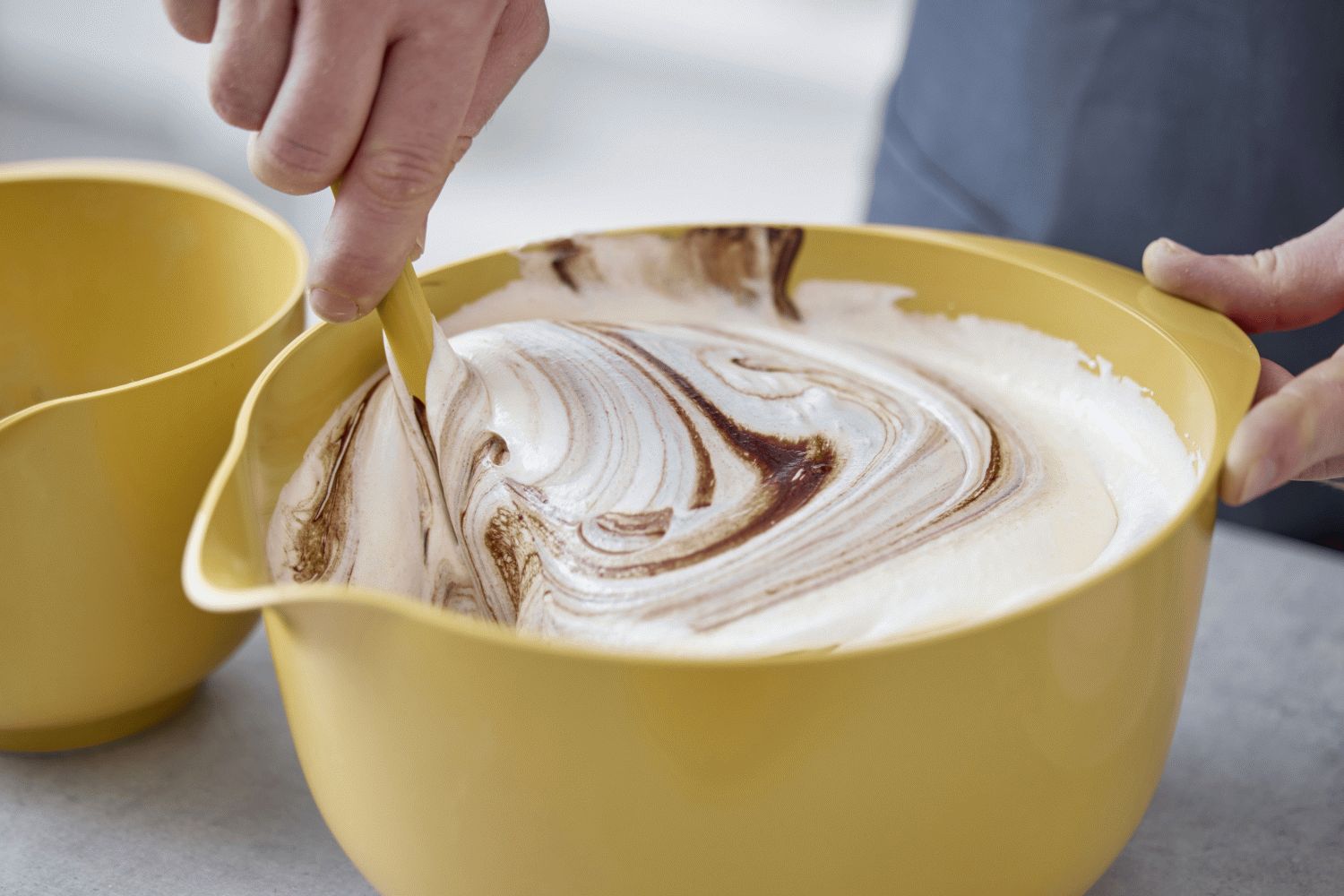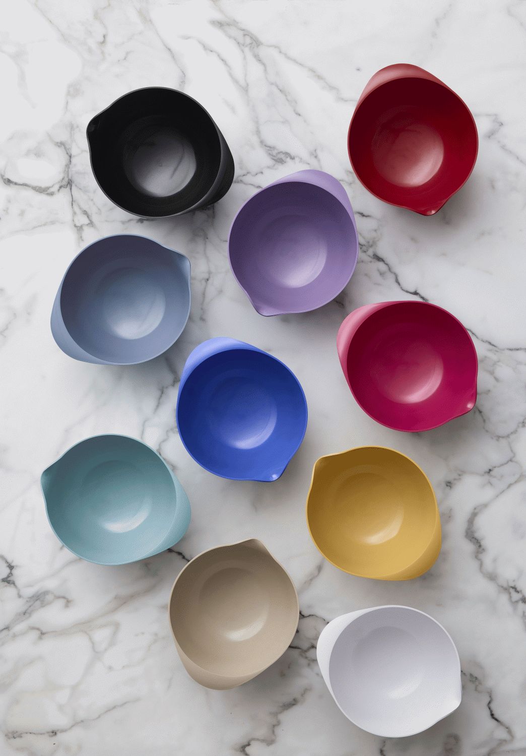 Med sin gennemtænkte udformning forener Margrethe-skålen æstetik og praktisk anvendelighed. Den ergonomiske kant giver et sikkert greb under omrøring, mens den integrerede hældetud minimerer spild ved udskænkning af røre eller dej. Den skridsikre bundring sikrer, at skålen bliver stående stabilt på bordpladen, selv under intensiv omrøring.