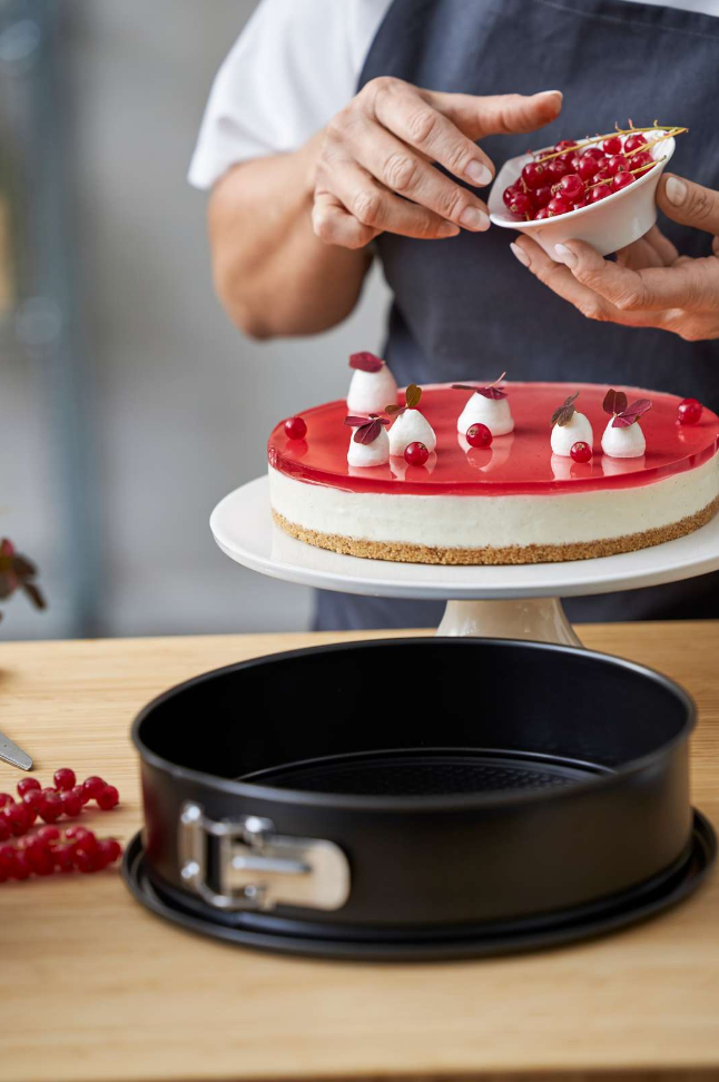 Blomsterbergs Springform, Ø24 cm, er en let stålform med non-stick-belægning, der slipper nemt og er let at rengøre. Formen rummer 2,2 liter, er 7,6 cm høj og anvendes til alle slags bagte rørekager som f.eks. sandkage, gulerodskage, drømmekage, chokoladekage samt til brød og tykke lagkage- og dessertbunde. Smør formens indvendige side og bund med bagespray eller neutral olie ved bagning. Formen er fremstillet af ECCES stål, en europæisk produceret ståltype i høj kvalitet. Stålet er bygget op i to lag, først et støttende, forstærket bundlag og herefter endnu et lag for yderligere forstærkning. Det er meget let og fleksibelt, hvilket giver en mere ensartet overflade og bedre varmefordeling.