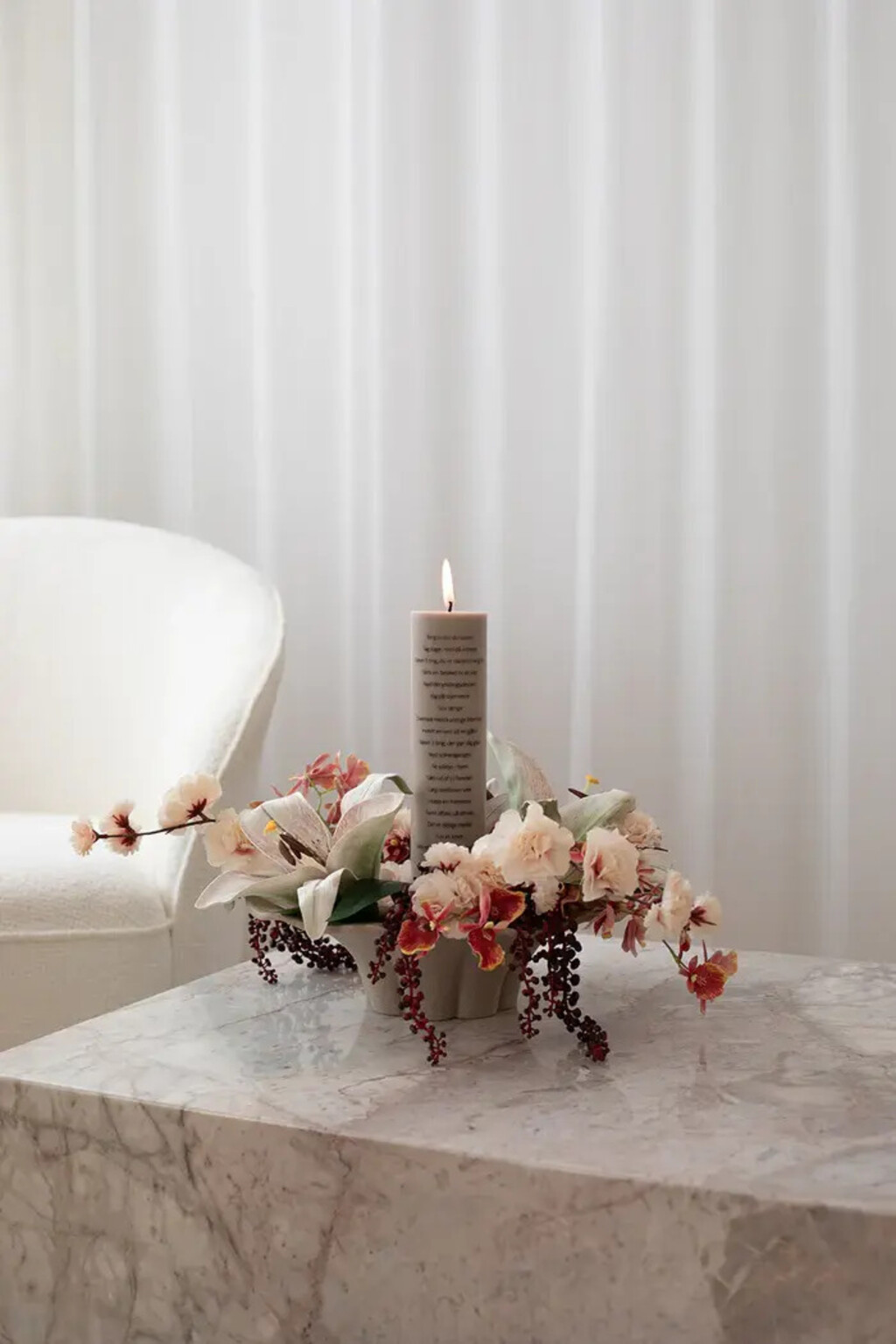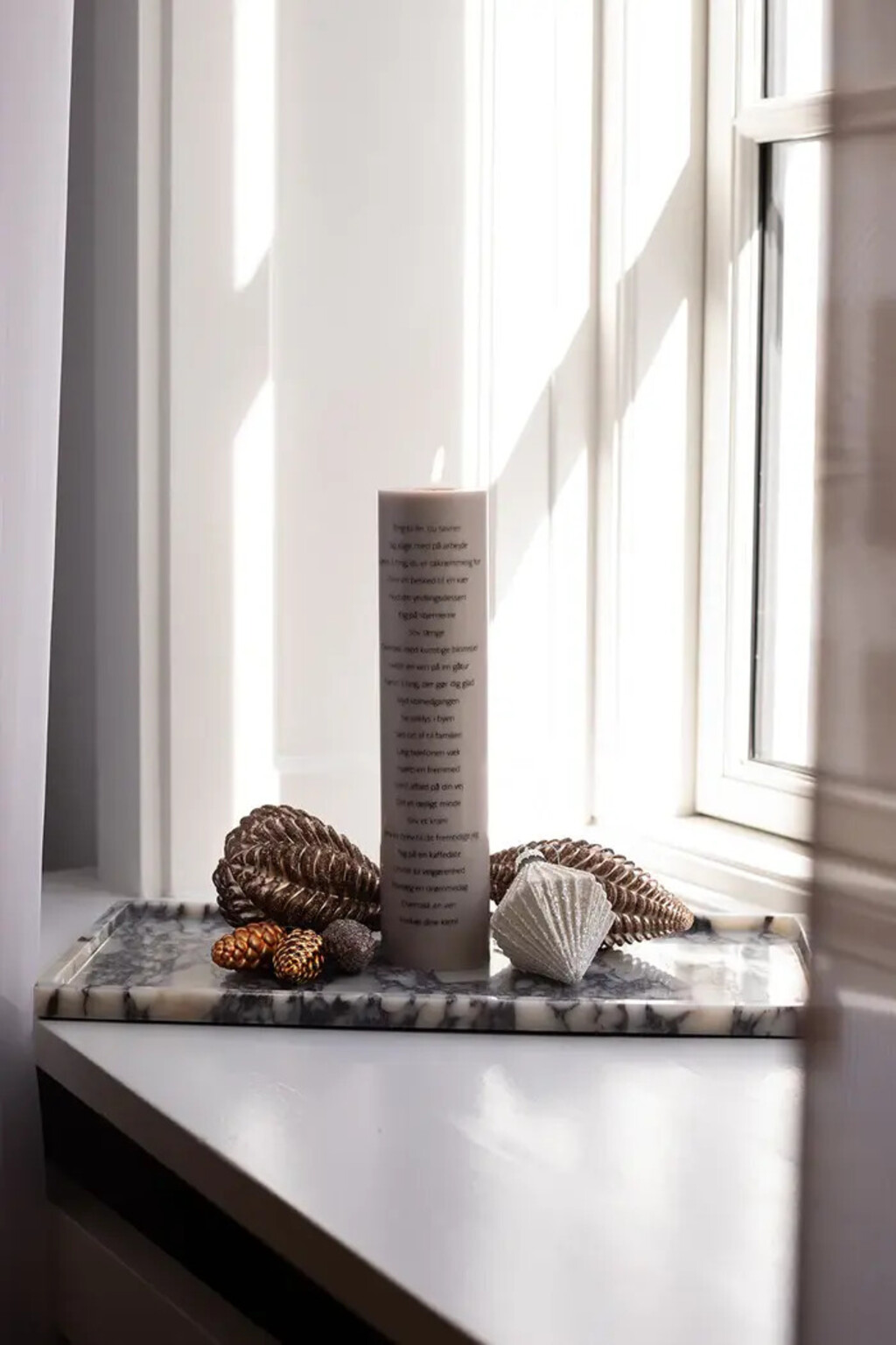 Med en diameter på 6 cm og den imponerende højde på 25 cm bliver dette kalenderlys et smukt dekorativt element på spisebordet, vindueskarmen eller som centerpiece i stuen. Den taupe-farvede overflade skaber en varm og indbydende atmosfære, der harmonerer smukt med både lyse og mørke interiørfarver.