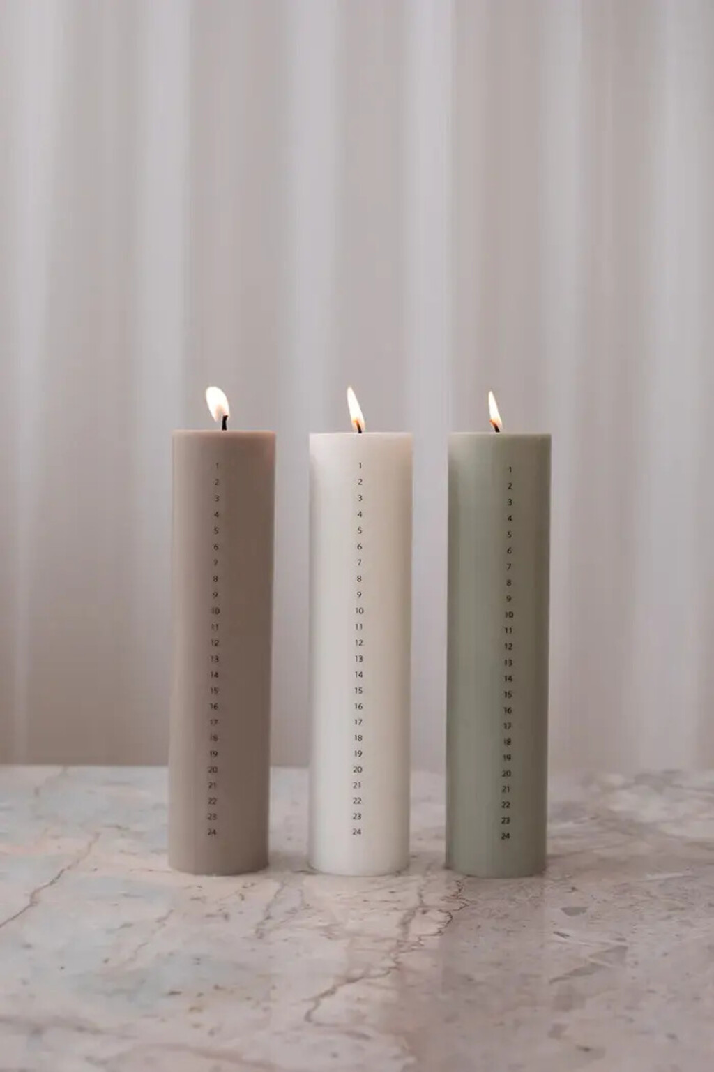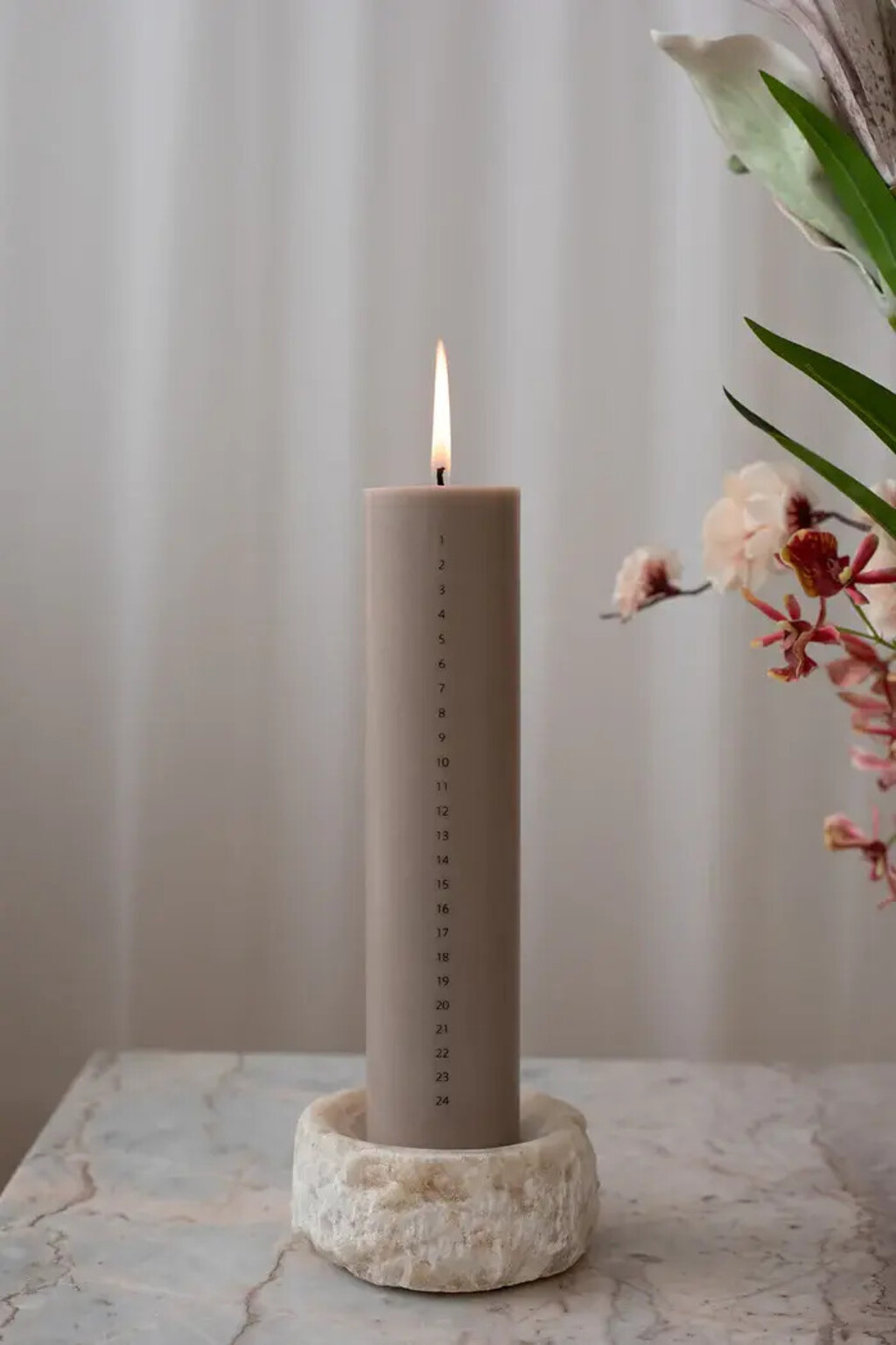 - Elegant kalenderlys i sofistikeret taupe-farve