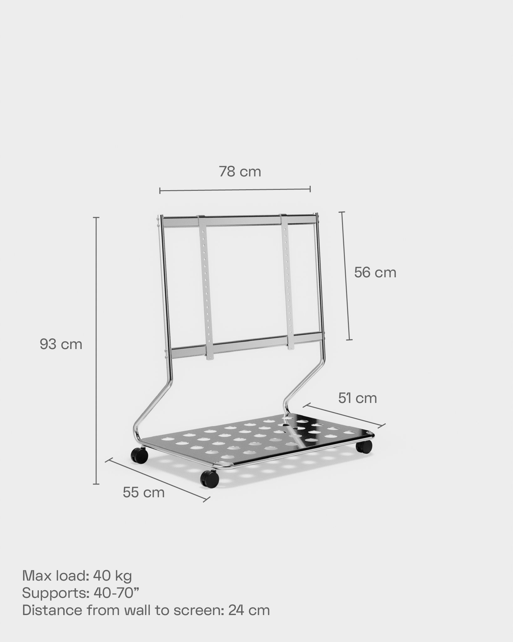 Disco passer til fladskærms-TV fra 40” til 70”. Alle Pedestals TV-standere er designet efter VESA-standarder og passer derfor til de fleste fladskærme. Skærmens højde afhænger af TV’ets størrelse og model. TV-standeren har en maks. belastning på 40 kg.