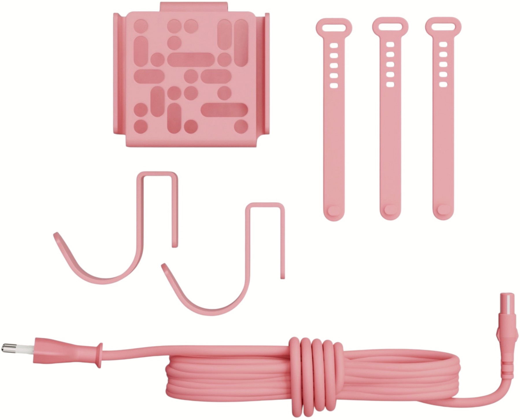 Bundlet kombinerer flere praktiske komponenter i én samlet pakke, hvilket gør det nemt at få styr på rodet bag TV'et. Remote Box Mount sikrer, at fjernbetjeningen altid har sin faste plads og er let tilgængelig, mens Hook Mount-beslag giver mulighed for at hænge kabler og andre elementer op på en struktureret måde. Det medfølgende strømkabel på 7,5 meter giver fleksibilitet i placeringen af TV'et, og de inkluderede silikone kabelbånd hjælper med at samle og fastgøre ledninger, så de ikke flyder frit omkring.