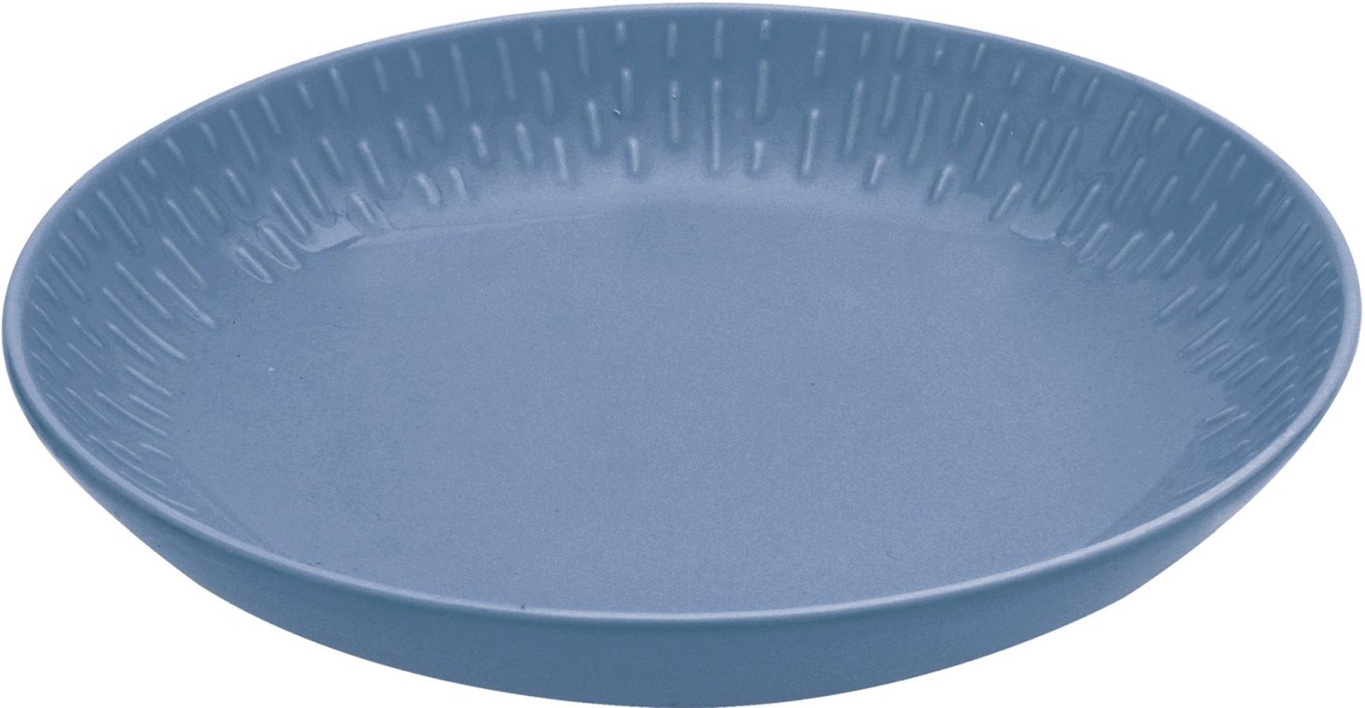 Tallerkenen er fremstillet i 100% hvidt porcelæn, der er dobbeltbrændt for ekstra styrke og holdbarhed. Den mørkeblå farve fremhæves af en ridsefri glasur, som sikrer, at tallerkenen bevarer sit smukke udseende selv efter gentagen brug. Det dekorative random relief giver overfladen en unik tekstur, der tilføjer visuelt liv til bordet uden at gå på kompromis med funktionen.