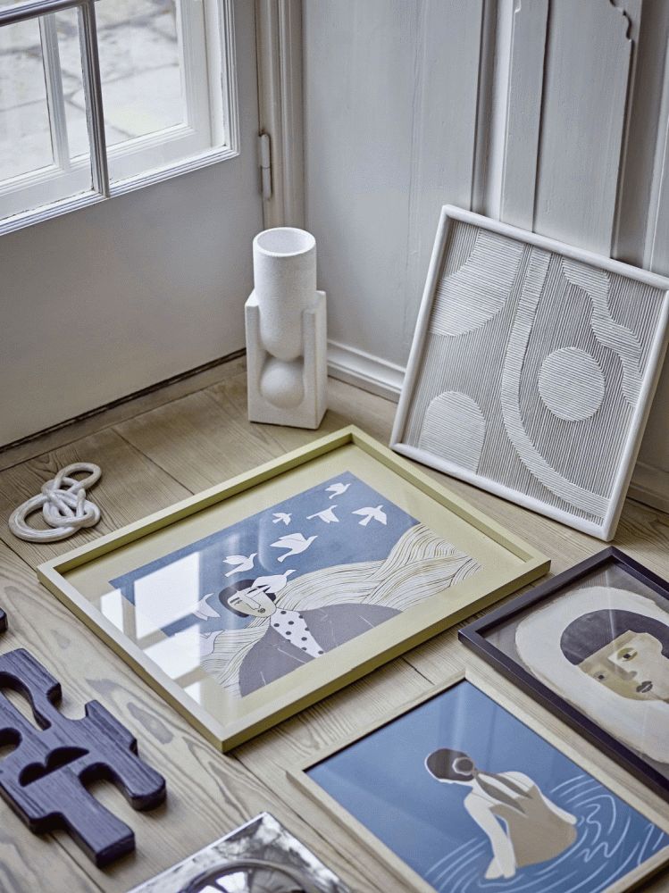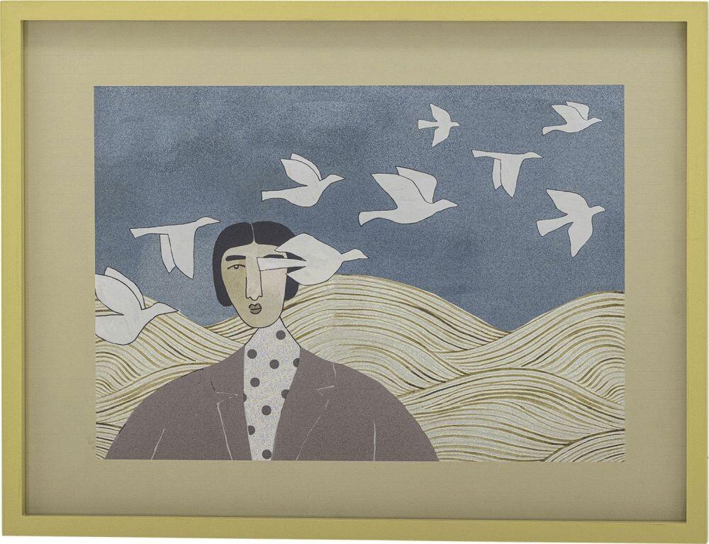 Flyvielle Illustrationen med ramme fra Bloomingville er en vægdekoration med en ramme i fyrretræ og front i glas. Motivet viser en stiliseret person i et grafisk landskab, hvor hvide fugle flyver hen over en blå himmel. Den lyse ramme indrammer udtrykket på enkel og moderne vis.Længde: 62 cm