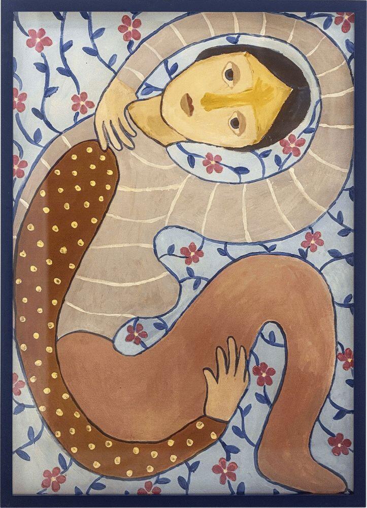 Floriesta Illustrationen med ramme fra Bloomingville er et indrammet kunsttryk på papir i en dyb blå ramme af fyrretræ med MDF og glas. Motivet viser en stiliseret figur på en blød, blomstrende baggrund i rosa og blå. Produktet er lavet af naturmaterialer, så der kan forekomme farvevariationer, hvilket gør hvert eksemplar unikt.Længde: 52 cm