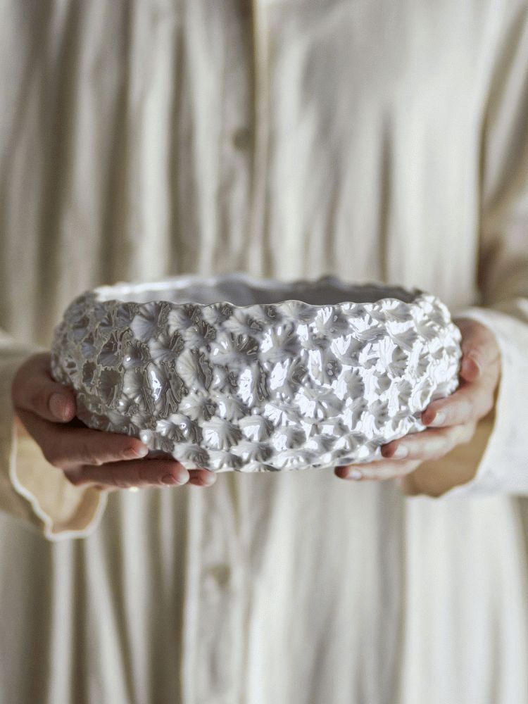 Skålen er fremstillet i robust stentøj og behandlet med en elektropletteret finish, der giver overfladen et eksklusivt præg. Det koralinspirerede mønster i bløde beige nuancer skaber en spændende kontrast til den glatte, hvide finish og giver skålen en unik tekstur, der fanger lyset på en smuk måde. Den organiske karakter gør Lowen skålen til et statement-piece, der passer lige så godt som centerpiece på spisebordet som til opbevaring af frugt eller som dekorativt element på en hylde.