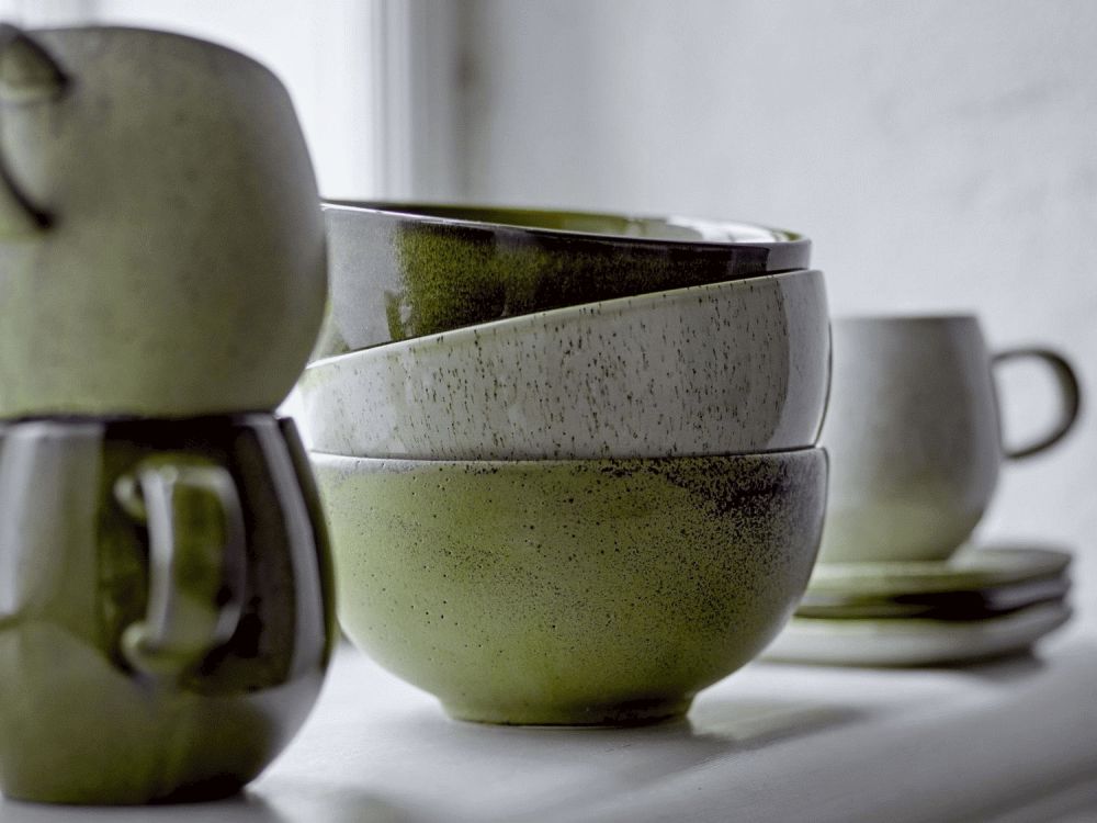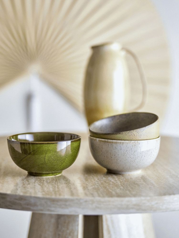 Den reaktive glasur betyder, at hver skål får sit eget unikke udtryk med naturlige variationer i mønster og farveintensitet. Dette gør hvert sæt til noget særligt, hvor ingen to skåle er helt ens. De subtile nuancer i den grønne farve skaber en rolig og indbydende atmosfære, der passer perfekt ind i både moderne og klassiske køkkener.