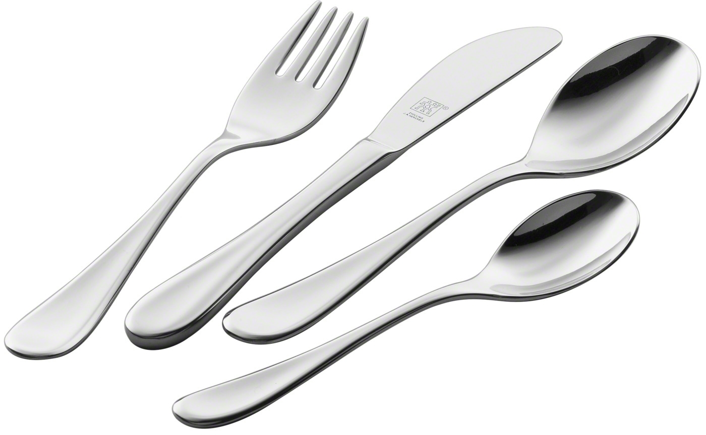 Børn har ofte problemer med at bruge almindelig størrelse spisebestik, da det ikke er egnet til mindre hænder. ZWILLING Filou spisebestik til børn er en alternativ løsning, egnet til børn fra alderen tre år og op.Små hænder kan sikkert arbejde med kniven, gaflen og skeen fra dette bestiksæt takket være den unikke form af disse små redskaber. Bestiksættet i fire dele er lavet af 18/10 rustfrit stål og tåler rengøring i opvaskemaskine. Den sløve kniv gør, at børn kan spise sikkert ved bordet. Tilføj dette børnesæt til dit bestik derhjemme og gør aftensmaden til et sjovere måltid for dine børn.