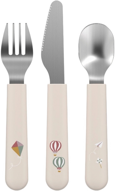 Bestiksættet består af tre essentiielle dele: en kniv med skærekant på den ene side, en gaffel og en ske - alt sammen designet med barnets udvikling for øje. De rundede plasthåndtag i PP-materiale sikrer et behageligt og sikkert greb for små hænder, mens de rustfri stålhoveder giver den nødvendige funktionalitet til måltiderne.