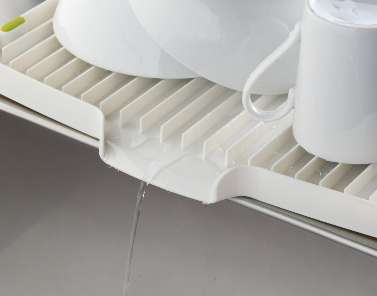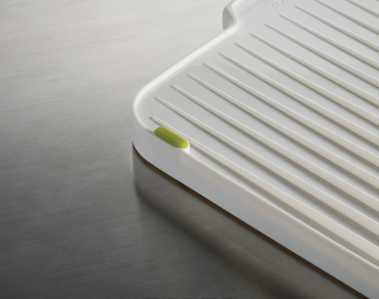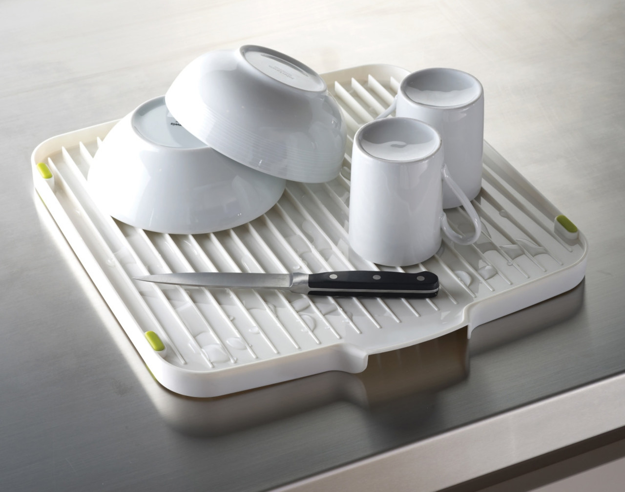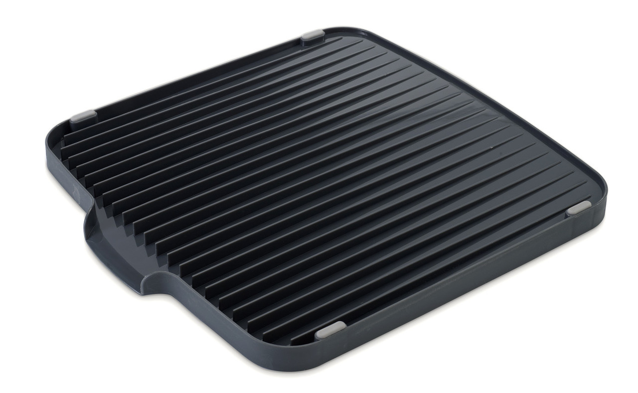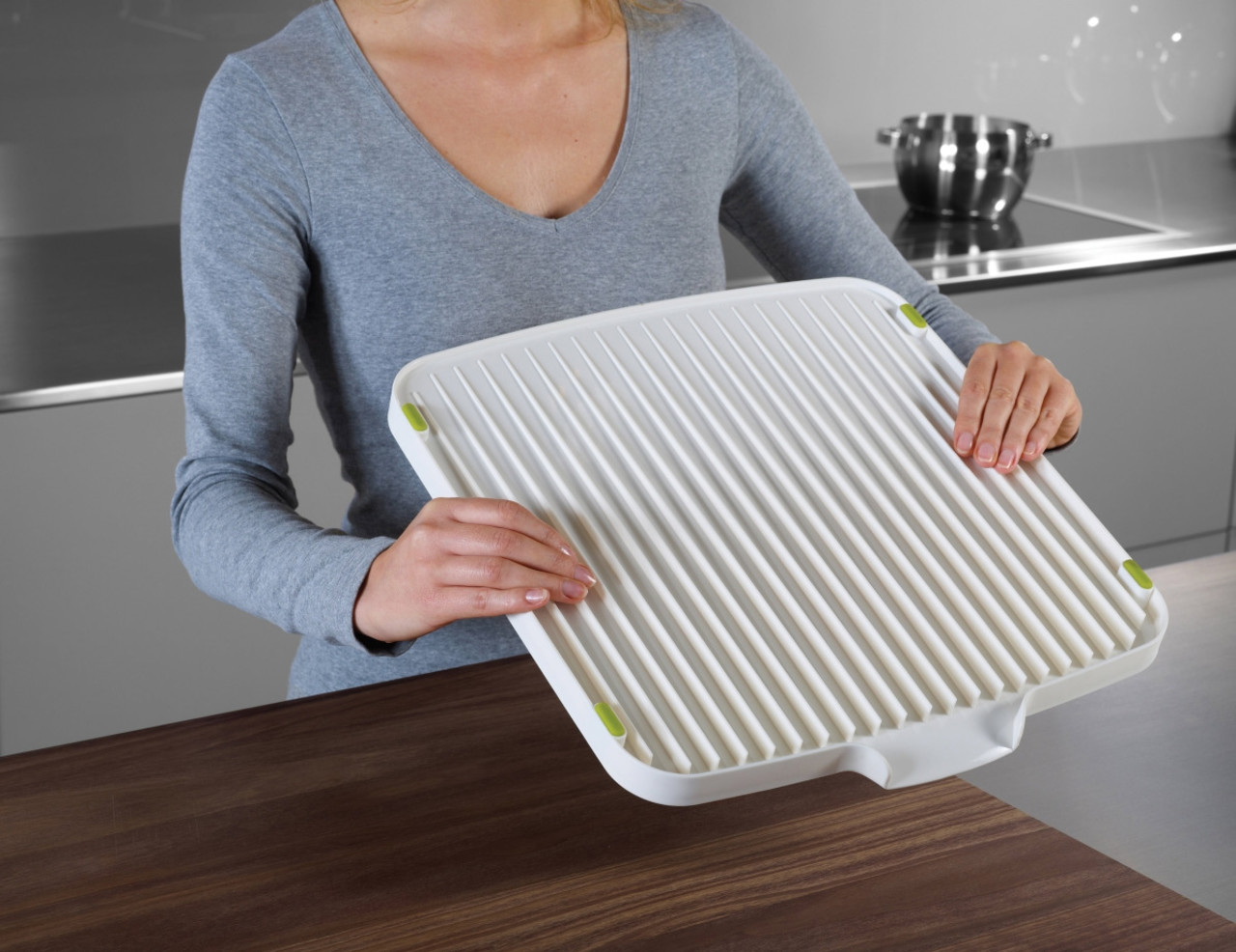 Opvaskebakke, som kan vendes efter behov. Ved den ene side, så kan vandet dræne ned i vasken, ved den anden side, holder vandet sig inde på opvaskebakken, så den kan placeres hvor som helst. Rillerne gør at vandet kan løbe fra. Skridsikker fødder, så den ikke rykker sig under brug.Mål: 40 x 37 x 3 cm.
