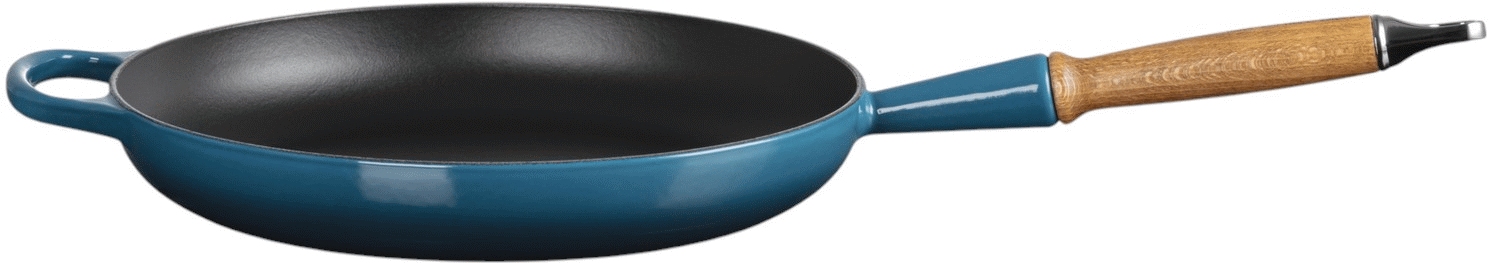 Le Creuset Signature stegepanden i Deep Teal kombinerer klassisk støbejernskvalitet med moderne design, der gør madlavning til en fornøjelse. Denne 28 cm store pande er fremstillet af Le Creusets berømte emaljerede støbejern, som har gjort mærket verdenskendt for holdbarhed og madlavningsresultater i topklasse. Den dybe teal-farve tilfører et elegant og tidløst præg til ethvert køkken, mens den praktiske funktionalitet sikrer perfekte resultater hver gang.Stegepandens unikke evne til at fordele varmen jævnt betyder, at dine råvarer brunes perfekt og ensartet. Dette er afgørende for at bevare saft, næring og smag i dine retter. Det redesignede træhåndtag forbliver køligt under madlavningen og giver et komfortabelt greb, mens det ergonomiske hjælpehåndtag sikrer stabil håndtering selv med tungere indhold. Den praktiske ophængningskrog giver fleksibilitet i opbevaringen.
