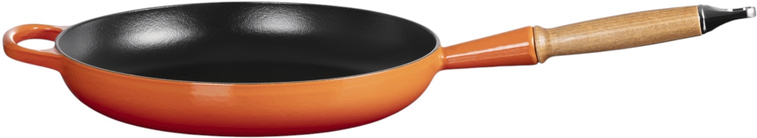 Le Creuset Signature Stegepande med Træhåndtag 28 cm i den livlige Volcanic-farve repræsenterer det ypperste inden for klassisk støbejernskøkkengrej. Denne stegepande kombinerer Le Creusets legendariske kvalitet med funktionelt design, der gør madlavningen til en fornøjelse i hverdagen. Den emaljerede støbejernspande fordeler varmen ensartet over hele madlavningsfladen, hvilket sikrer perfekt bruning og en hurtig forsegling af råvarernes overflade, så alle smagsnuancer og næringsstoffer bevares i dine retter.Det redesignede træhåndtag holder sig behageligt køligt under madlavningen, mens det ergonomiske hjælpehåndtag giver ekstra stabilitet og kontrol, når panden skal flyttes. Den praktiske ophængningskrog gør det muligt at opbevare panden på væggen - både praktisk og dekorativt i et moderne køkken.
