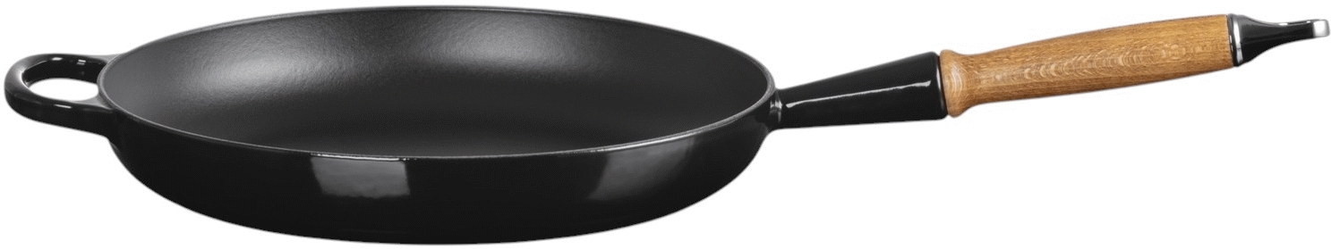 Le Creuset Signature stegepande med træhåndtag kombinerer klassisk håndværk med moderne funktionalitet i køkkenet. Denne 28 cm store stegepande i sort emaljeret støbejern er udviklet til at blive en uundværlig del af din daglige madlavning. Det ikoniske støbejern, som Le Creuset er kendt for, sikrer en exceptionel varmefordeling, der hurtigt forsegler råvarernes overflade og bevarer både saft, næringsstoffer og den fulde smagsoplevelse i dine retter.Stegepanden er designet med brugervenlighed for øje. Det ergonomiske hjælpehåndtag giver et sikkert greb, mens det redesignede træhåndtag ikke blot tilføjer et elegant touch, men forbliver køligt under madlavningen for maksimal komfort. En praktisk indbygget krog gør det nemt at hænge panden op, når den ikke er i brug.