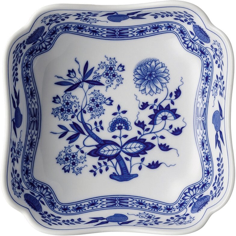 Hutschenreuther Blau Zwiebelmuster skålen forener klassisk håndværk med tidløs elegance i et design, der har præget borddækningen siden 1930. Den kvadratiske form giver en moderne fortolkning af det traditionelle Zwiebelmuster-mønster, som har været et kendetegn for fineste porcelæn gennem generationer.Skålen er fremstillet i førsteklasses porcelæn og dekoreret med det ikoniske blå Zwiebelmuster-mønster, der er håndmalet med omhyggelig præcision. Det karakteristiske mønster med sine stiliserede blomster og ornamentale detaljer skaber en raffineret kontrast mod det hvide porcelæn og tilføjer et strejf af klassisk elegance til ethvert måltid.