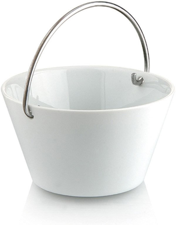 Disse smukke porcelæns skålene fås i fire forskellige størrelser og kommer alle med en hank i rustfrit stål. Skålene egner sig godt til snaks, varme pastaer eller kartfoler, lækre salater mm. Det fine håndtag gør det nemt, at bærer skålen ind på bordet eller ud i haven.